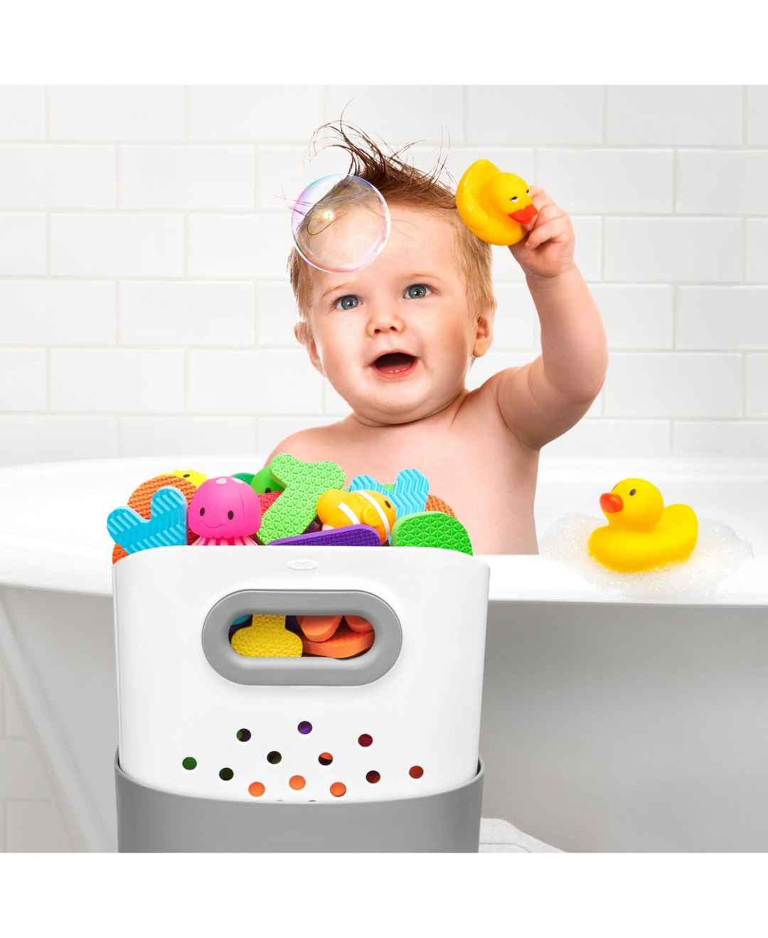 Keep your little one's bath-time buddies neatly stored when not in use in Oxo's Tot Stand Up Bath Toy Bin. Its large-capacity design holds everything from rubber duckies to toy boats, while the hole pattern on its sides lets air in to dry them quickly.