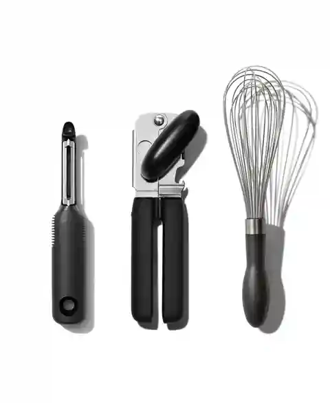 Tackle common kitchen duties with this convenient set featuring our top three best-selling tools. The Oxo good grips everyday kitchen tool and utensil, balloon whisk, and soft-handled can opener. These everyday essentials add comfort and convenience to common kitchen tasks.