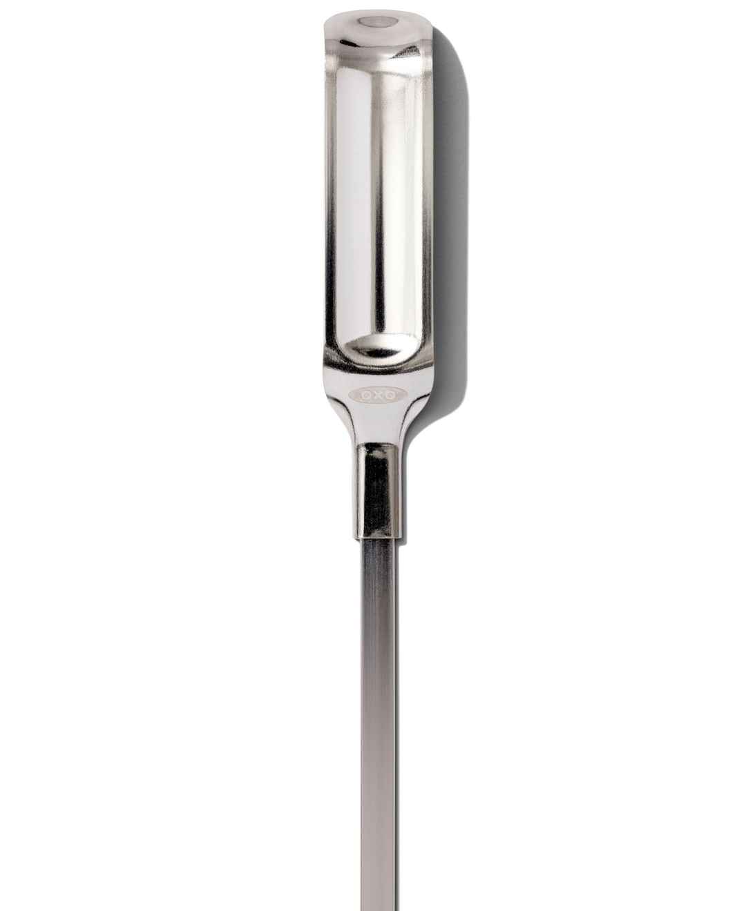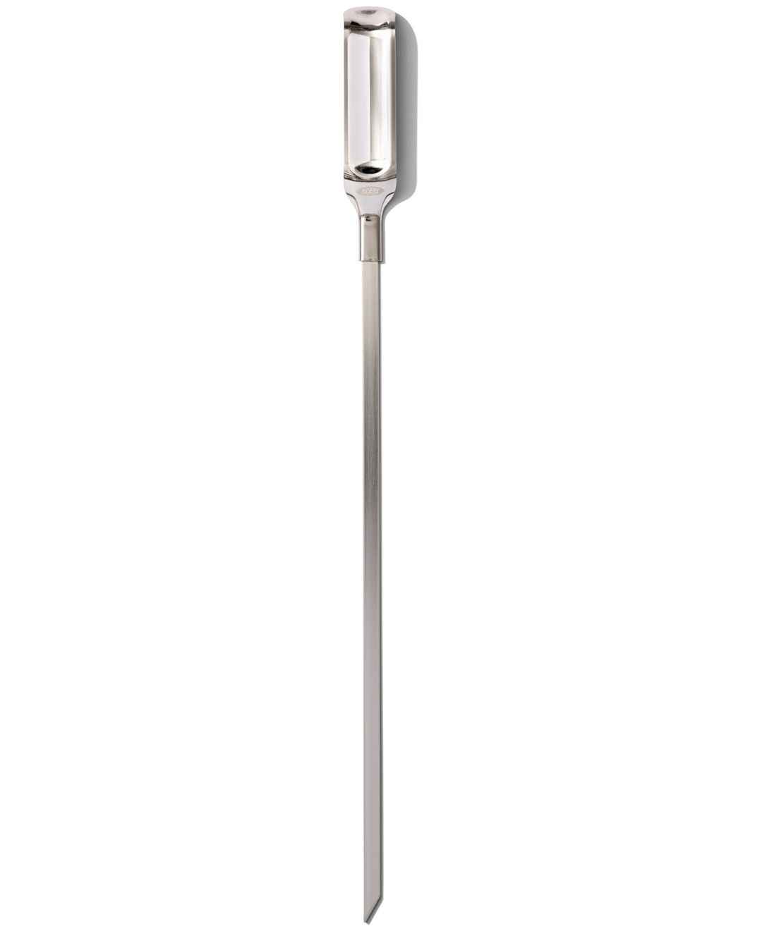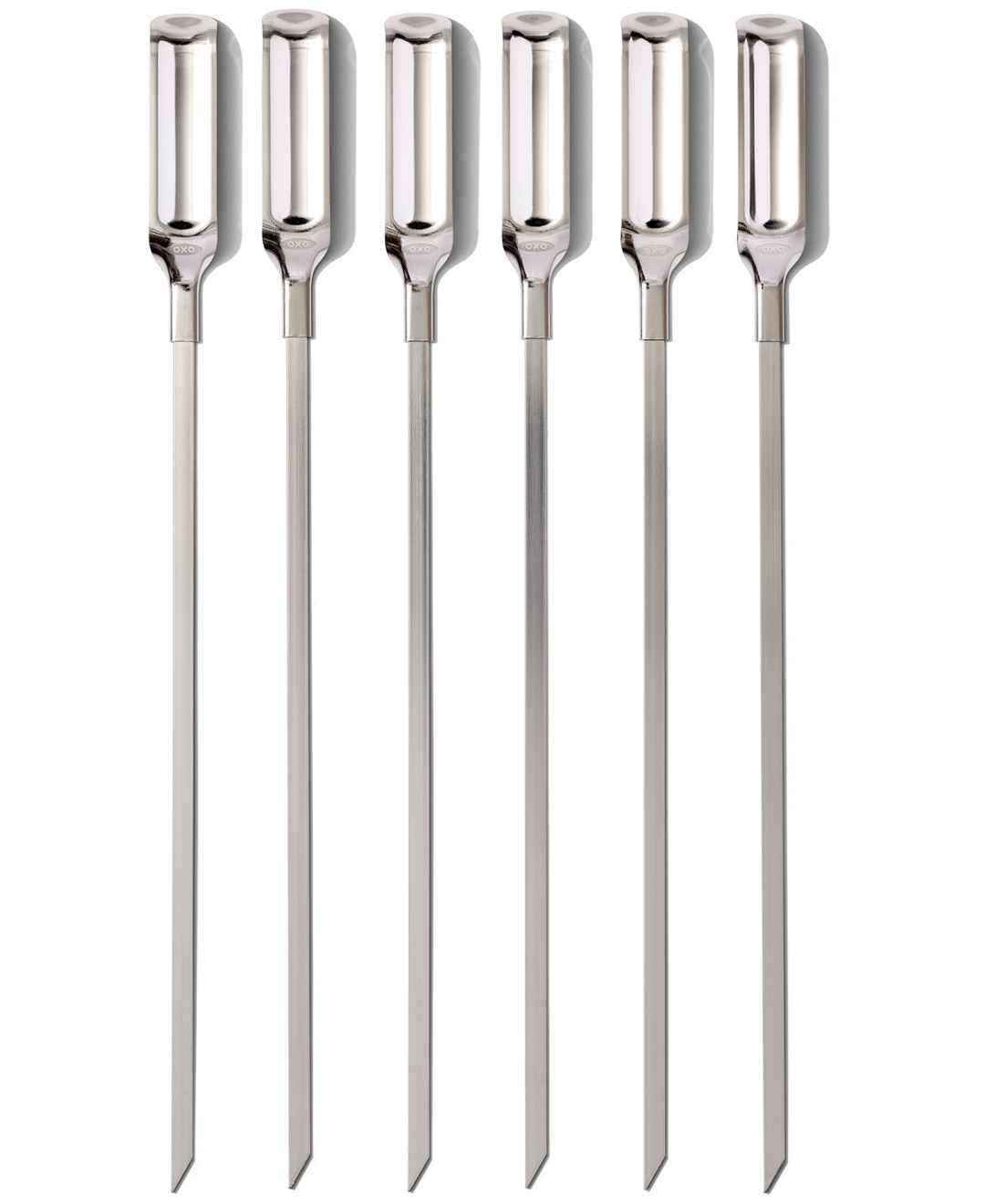 Grill meat, veggies and fruit to perfection using this set of stainless steel Good Grips skewers from Oxo. Ingredients slide easily onto the sharp points and the unique flat design keeps your kabobs steady as they cook.