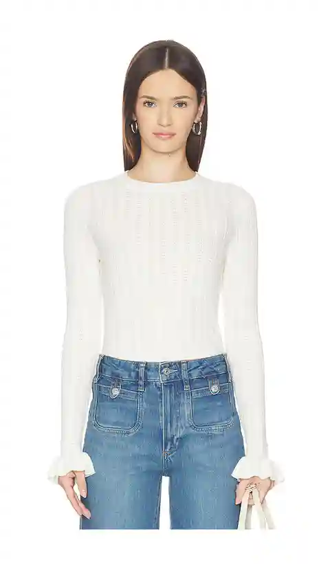 PAIGE Ophelia Top in Ivory. - size M (also in S) PAIGE Ophelia Top in Ivory. - size M (also in S) 70% organic cotton, 20% ciclo recycled nylon, 10% silk. Made in China. Dry clean only. Pull-on styling. Lightweight knit fabric. Ruffled cuffs. Garment is made with a semi-sheer fabric, undergarments ca...more
