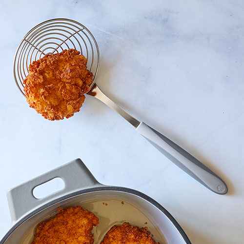 The stainless steel Spider Strainer has a long, soft-grip handle for quickly and safely straining delicate foods out of boiling water, soups, stocks, or oil.