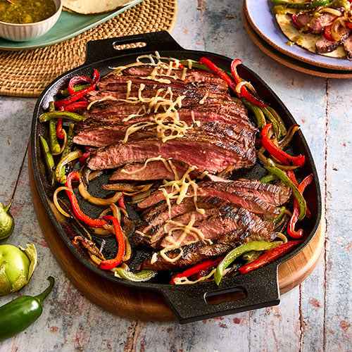 Enjoy fajitas at home with the Cast Iron Sizzle Skillet & Wood Trivet. Make a memorable meal with the skillet and serve it while its hot with the trivet.