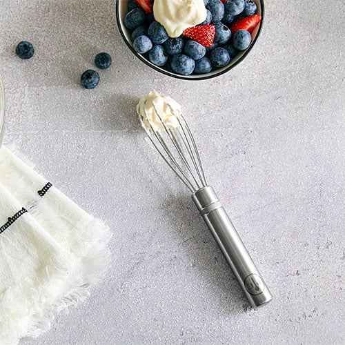 Versatile enough for whisking, blending or mixing light batters in smaller bowls. Rounded handle end combined with securely sealed wires offers comfort and control.