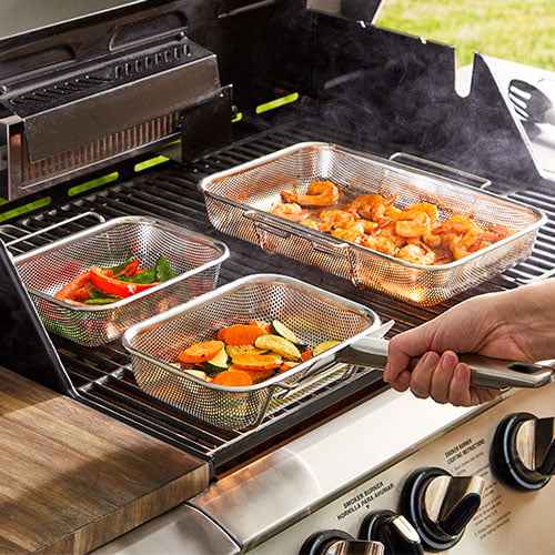 Create your perfect outdoor cooking station with these grill pans that are great for cooking delicate foods like shrimp without skewers. Get even, smoky flavor with ease!