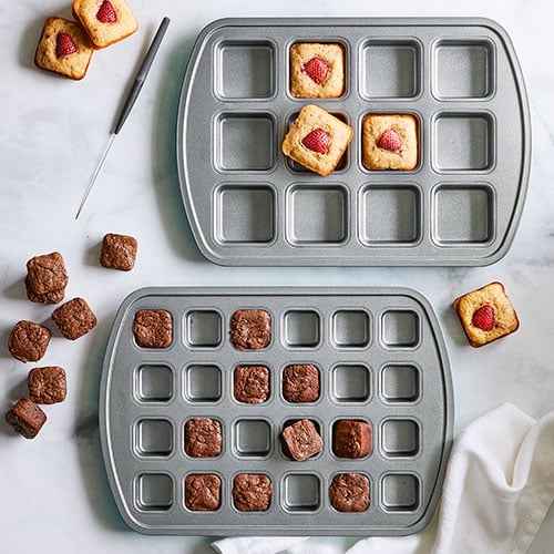 Make bite-sized brownies, cakes, and mini appetizers with this set of two baking pans and a cake tester and releasing tool.