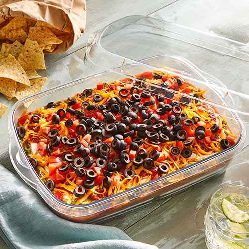 Our fridge-, freezer-, and dishwasher-safe Cool & Serve dish keeps food cool for 46 hours, includes two chilling pucks, and features a spill-resistant lid.