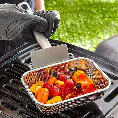 Grill sides of chopped veggies, shrimp, or diced potatoes without losing them between the grates of your grill! Get plenty of smoky flavor and even cooking with this mesh stainless steel pan.