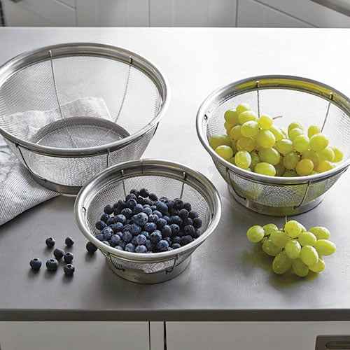 Set of three stainless steel mesh colanders nests together for convenient storage.