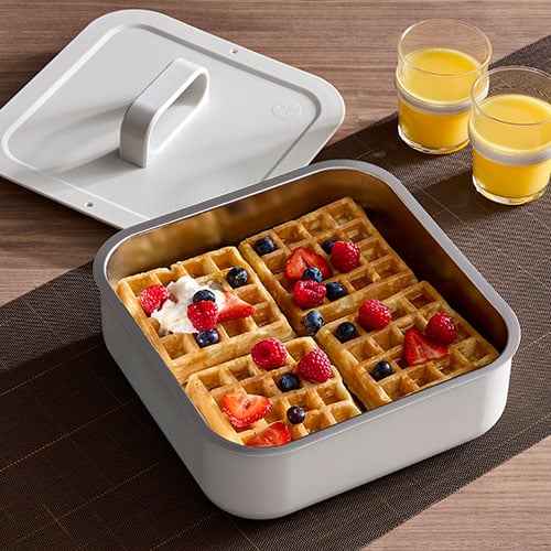 This square insulated serving bowl keeps food hot or cold and saves space on your table or in the fridge.
