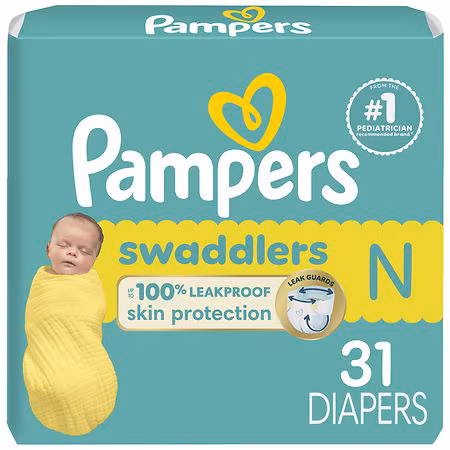 Keep your baby comfortably dry all night long with Pampers Swaddlers. These baby diapers feature an absorbent liner that locks away wetness and help keep your baby 3X drier* for all night comfort. Pampers Swaddlers are hypoallergenic, dermatologist-approved by the Skin Health Alliance, and free of e...more