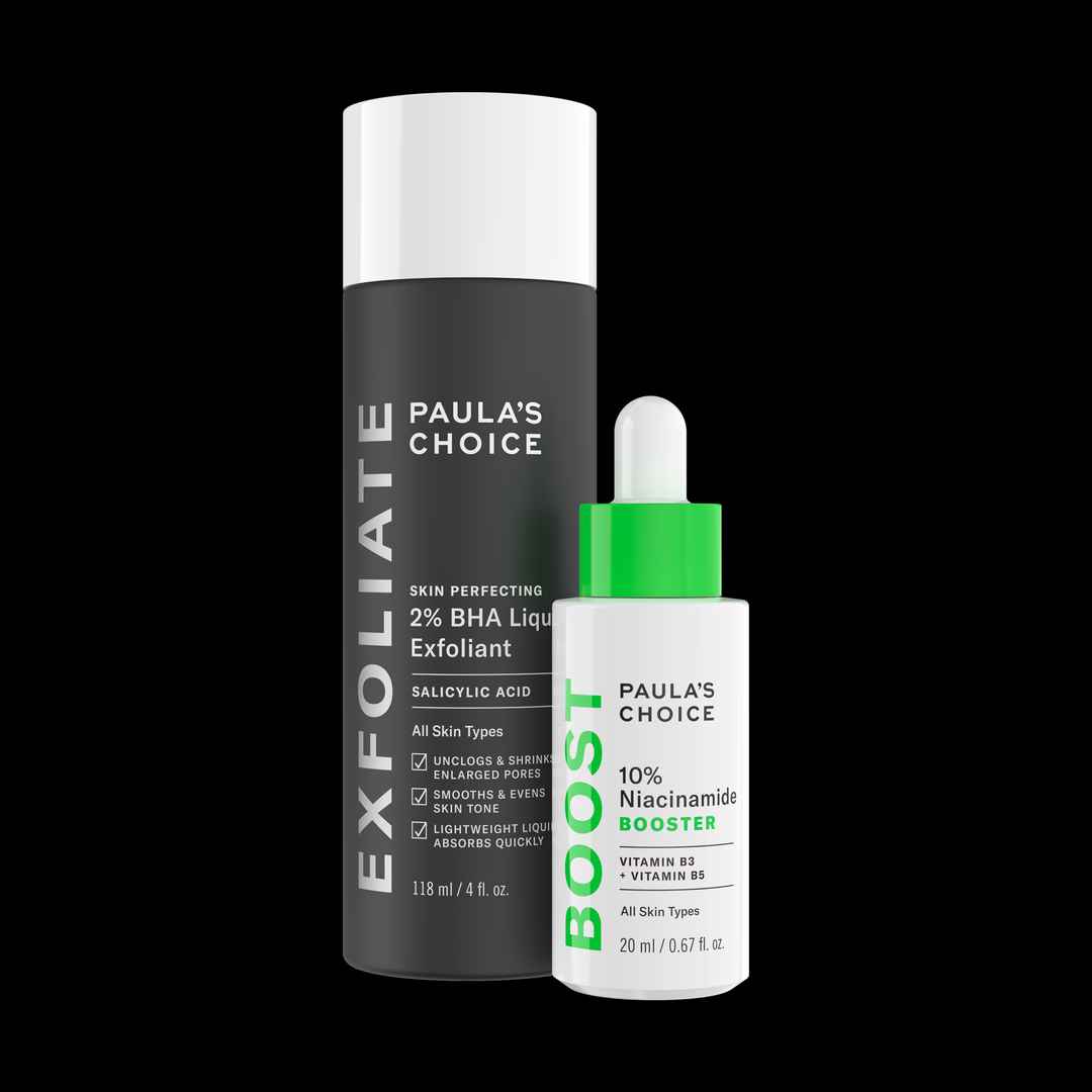 2% BHA clears pores allowing 10% niacinamide to quickly improve uneven tone, minimize pores and visibly reduce wrinkles and discolorations. Quickly unclogs pores Visibly minimizes pore size Brightens & evens skin tone Use together up to twice daily. Paula's Choice Niacinamide + BHA Duo | Kit