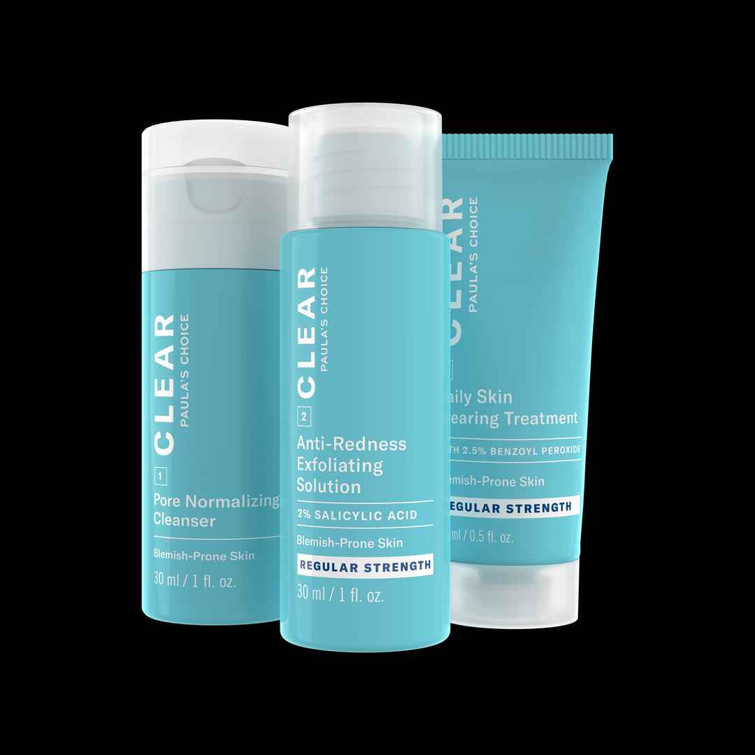 This simple-to-use 3-step routine quickly combats and controls acne and breakouts, unclogs pores and calms redness without causing dryness or flaking. For mild to moderate acne. 2-week kit. No harsh ingredients that can cause dry, flaky skin. Paula's Choice Clear Regular Strength Travel Kit