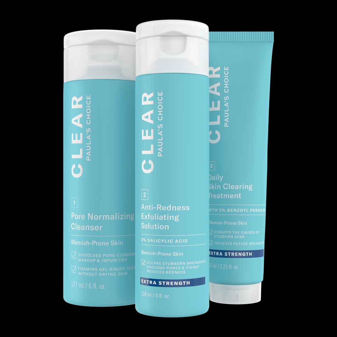 This 3-step routine quickly combats and controls stubborn acne and breakouts, unclogs pores and calms redness without causing dryness or flaking. For stubborn acne. Fast acting formulas fight acne-causing bacteria. Contain no harsh ingredients. Paula's Choice Clear Extra Strength Kit