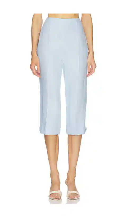 Posse Harper Capri Pant in Baby Blue. - size L (also in M, S, XS) Posse Harper Capri Pant in Baby Blue. - size L (also in M, S, XS) 100% linen. Dry clean only. Hidden side zip closure. Bow detailing at hem. Midweight linen fabric. Item not sold as a set. 16 at the leg opening. PSSE-WP11. PS1800-BLU.