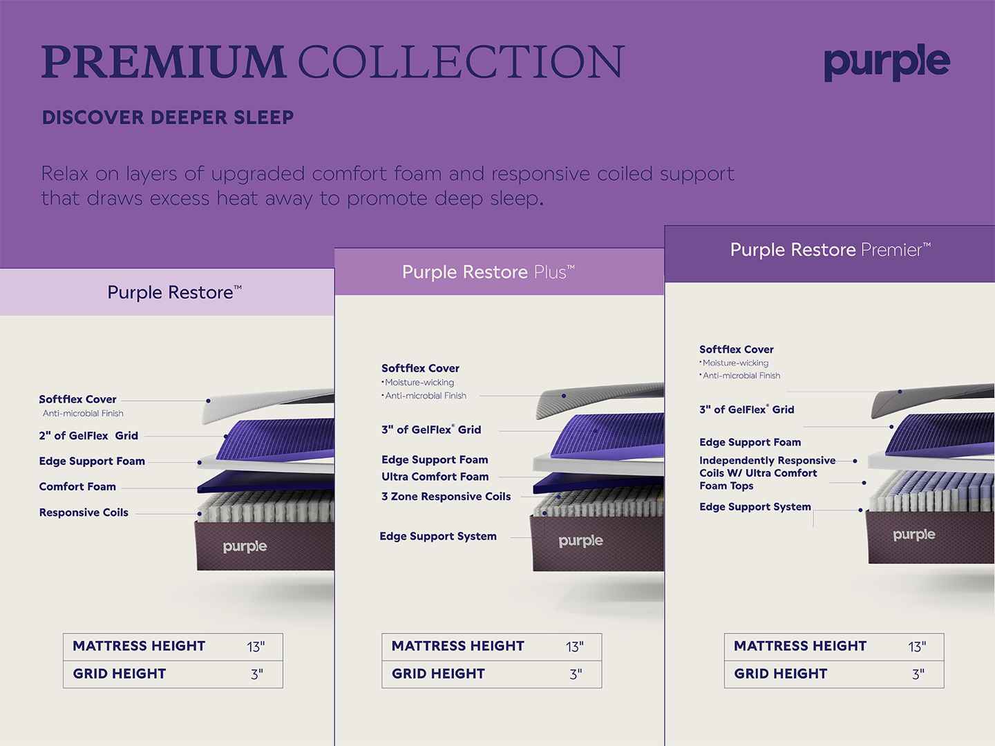 Purple RestorePremier mattress combines the pressure point cradling benefits from the GelFlex Grid with our most dynamic Independently Responsive Coil System that delivers pin point pressure relief and full body support while allowing superior breathability for a restorative sleep. Available in a so...more