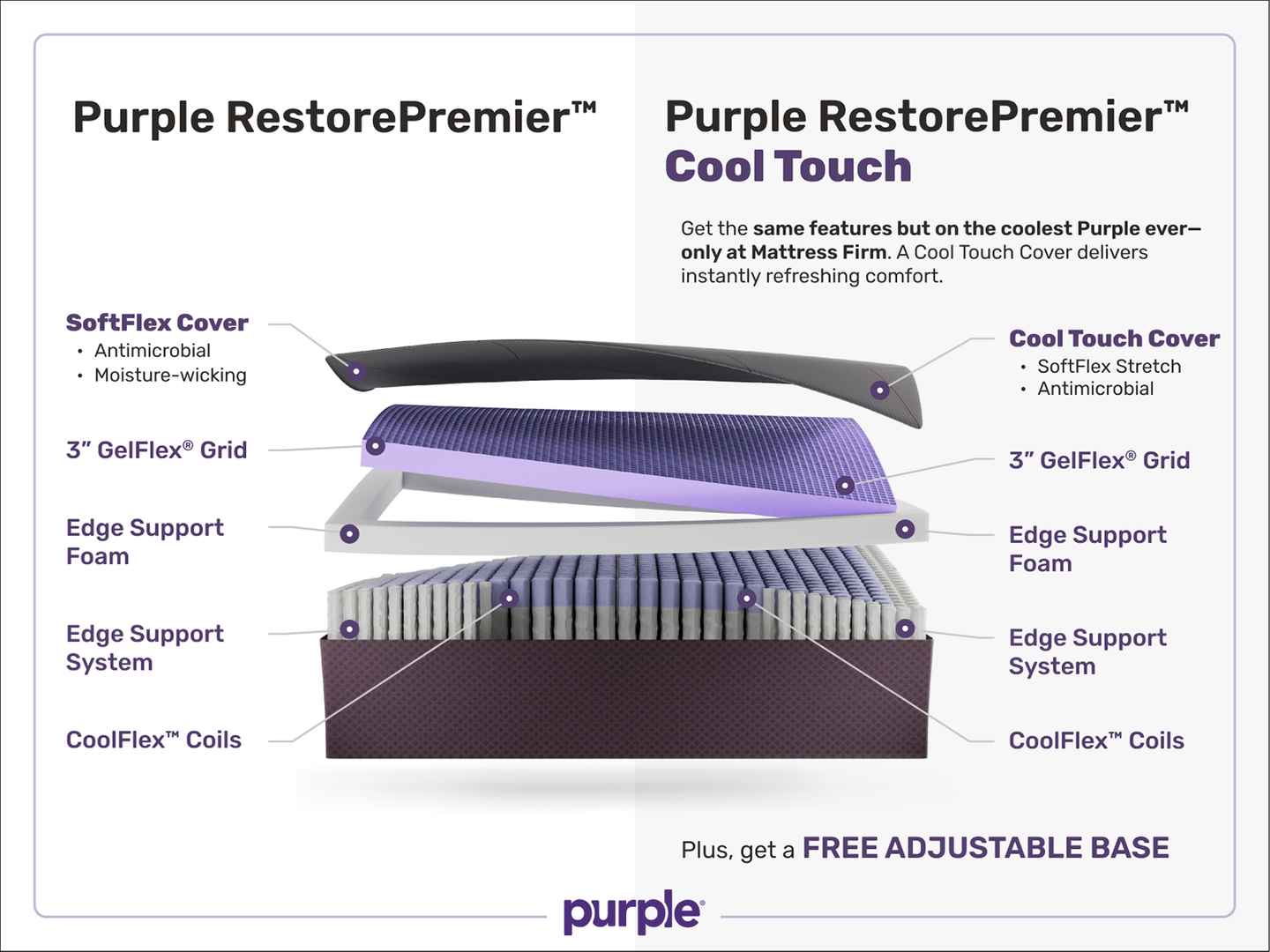 The Purple RestorePremier Cool Touch Mattress combines pressure point cradling comfort from the GelFlex Grid with our most dynamic CoolFlex Coils system that delivers pin point pressure relief and full body support while allowing superior breathability for restorative sleep. Cool to the touch yarn f...more