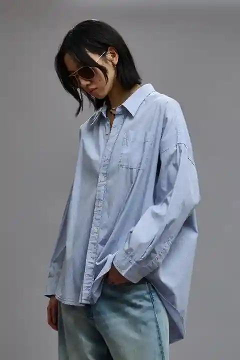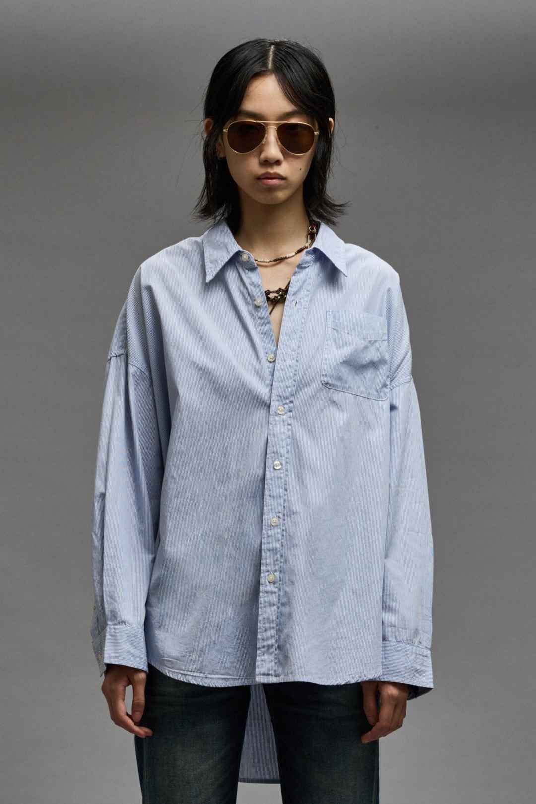 Classic drop neck shirt; Front pocket/ button up; Slightly oversized; Blue/white pinstripe; 100% Cotton; Model is 5'11 and wearing sizeM; Bust 34; waist 24; hips 35; Machine wash cold, Do not tumble dry; Imported; R13W7469-302; This style runs slightly large. If in between sizes, we recomme...more