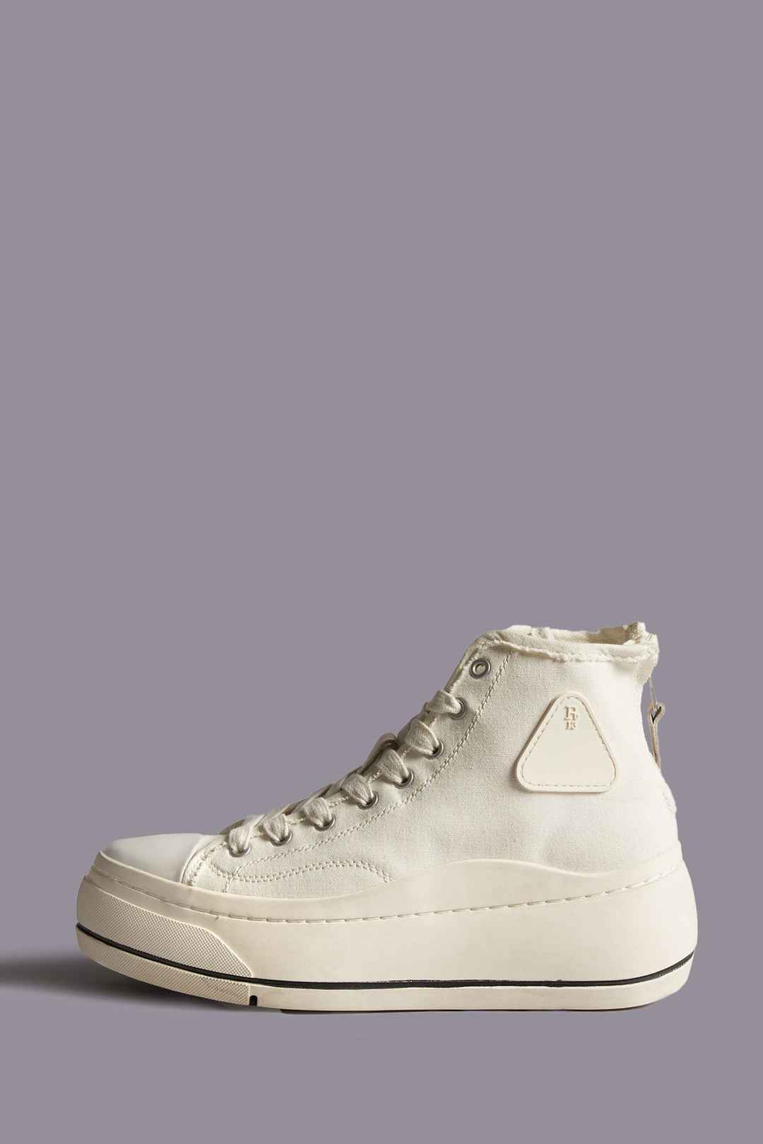 Classic Canvas high-top sneaker with lace-up closure, hand stitchedplatform and toe cap. Color:Ecru; Round leather white/white cap toe and white platform; Lace-up closure; Signature R13 logo on side; Imported; R13S5029-002; This style runs slightly small. If in between sizes, we recommend sizin...more