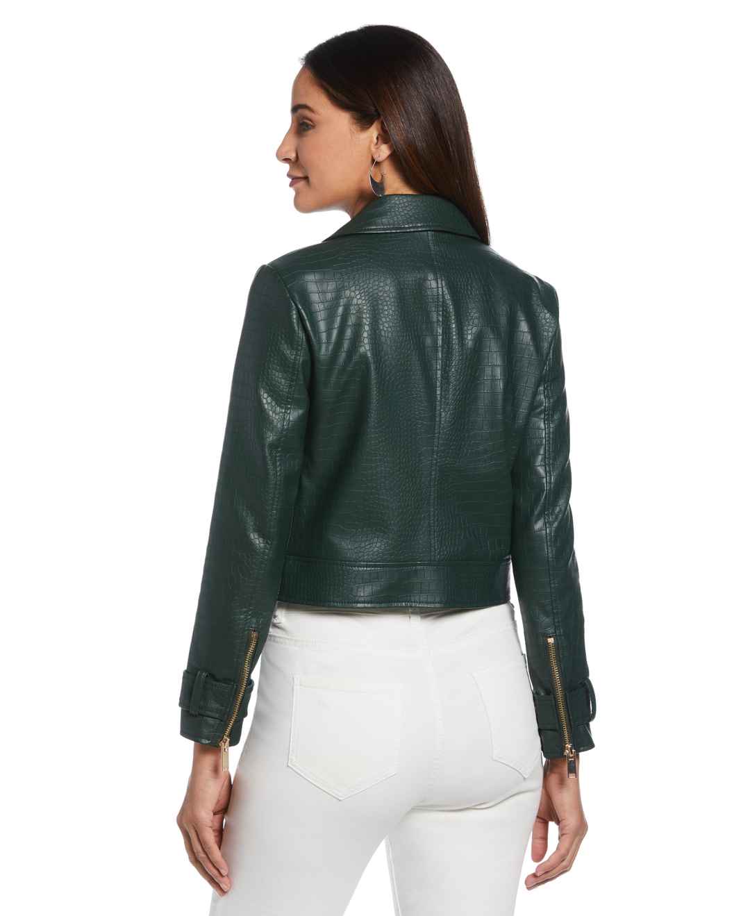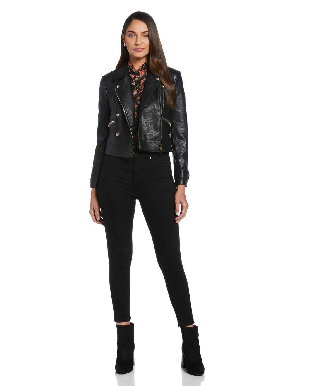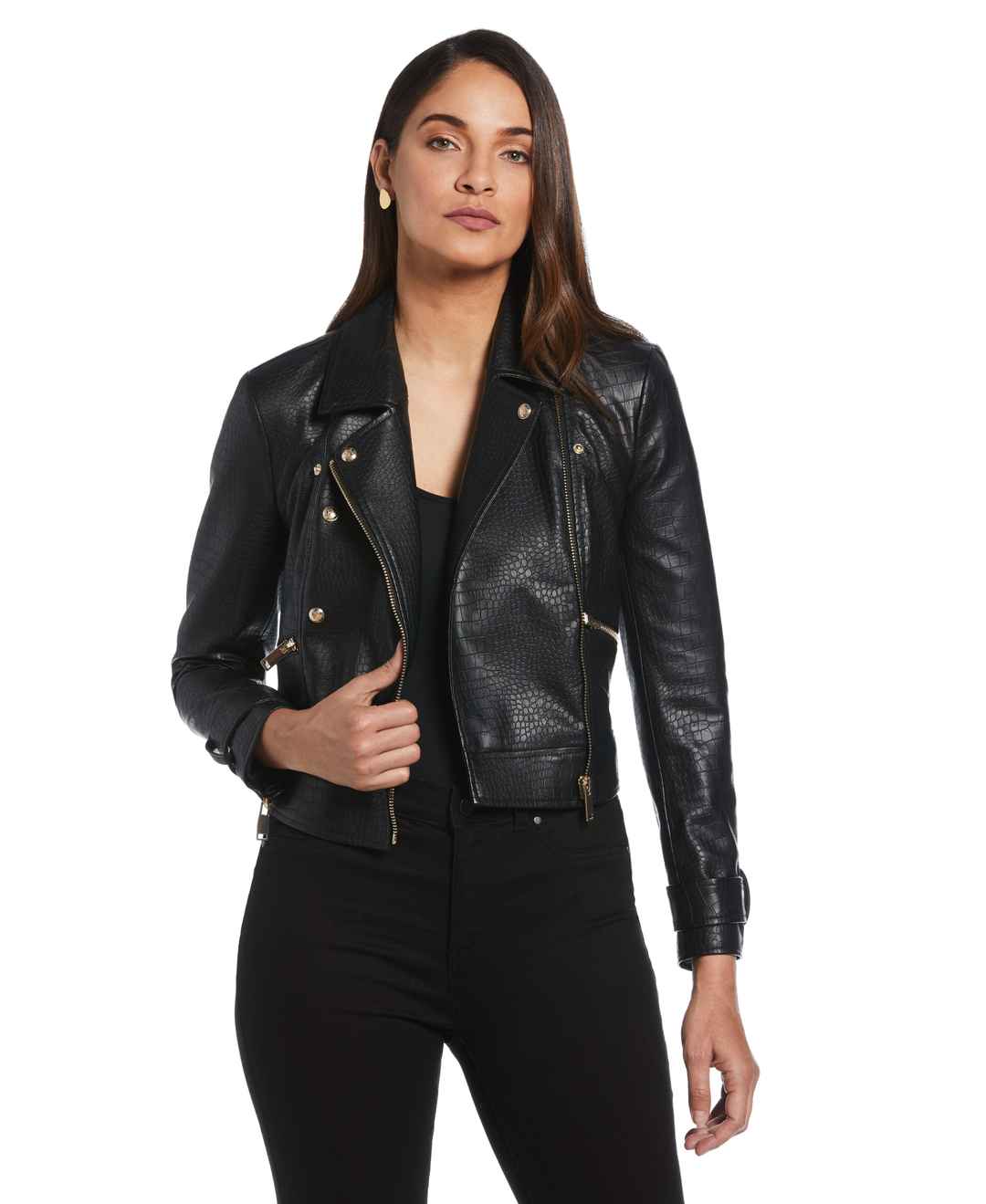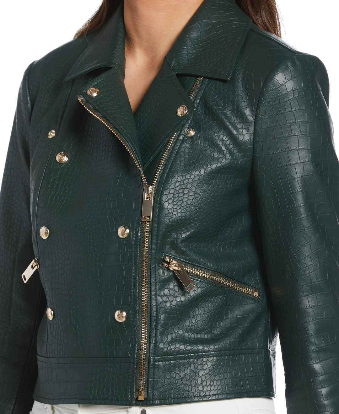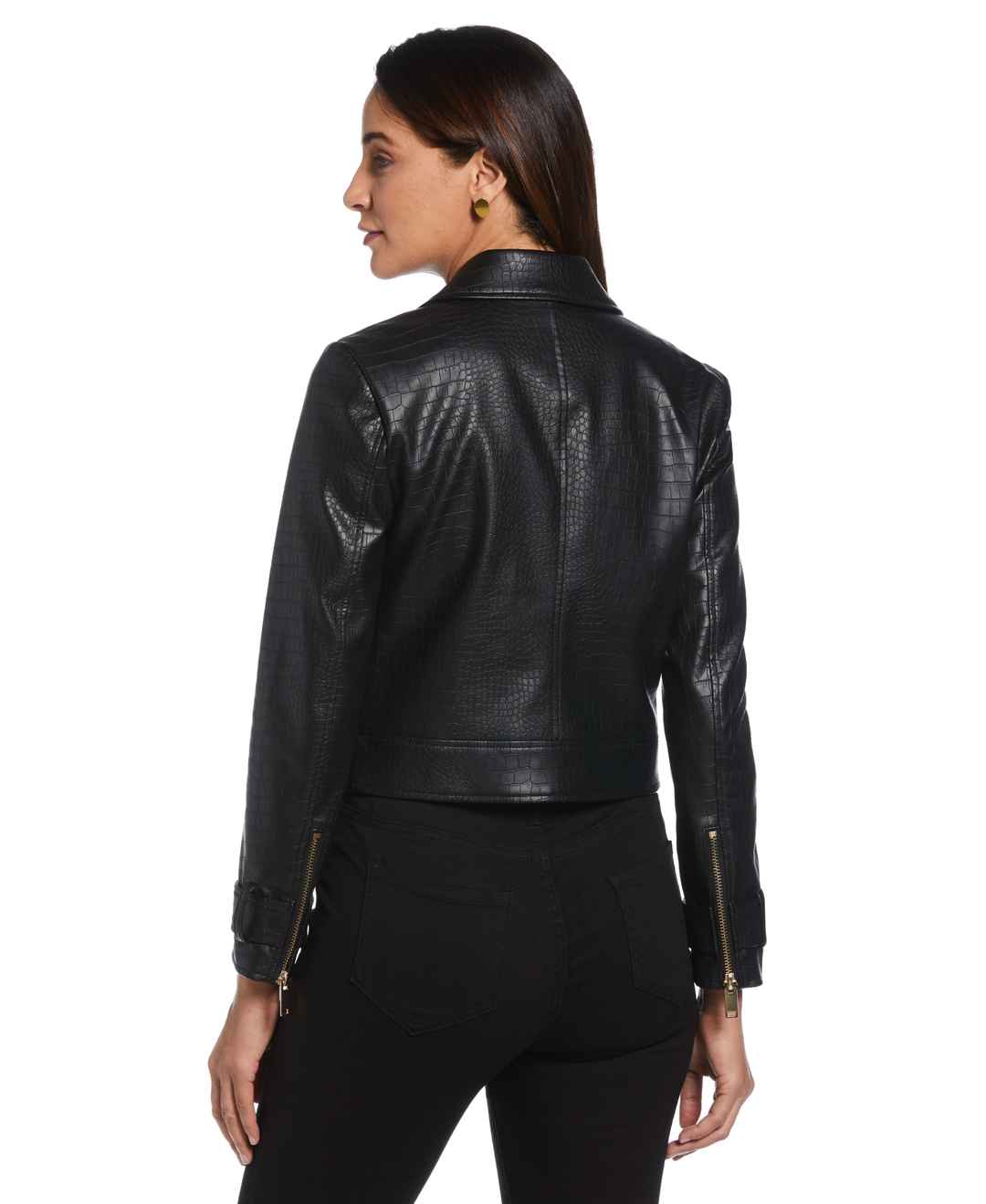 This women's faux leather jacket from Ella is a chic and cruelty - free addition to your modern wardrobe. It's crafted from vegan leather that uses 100% polyurethane to create an authentic leather look with a fashionable mock croc finish. This light jacket features classic moto styling with a notch ...more