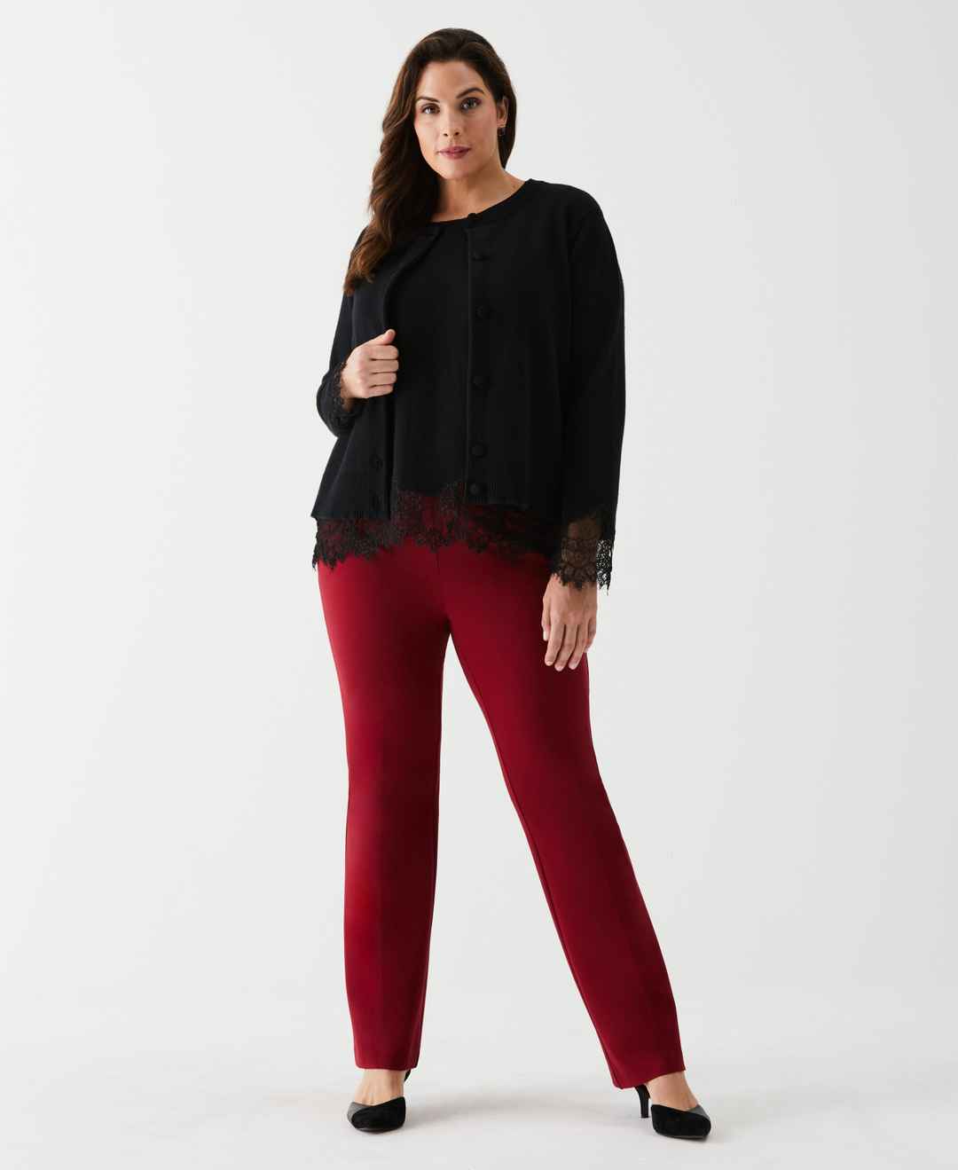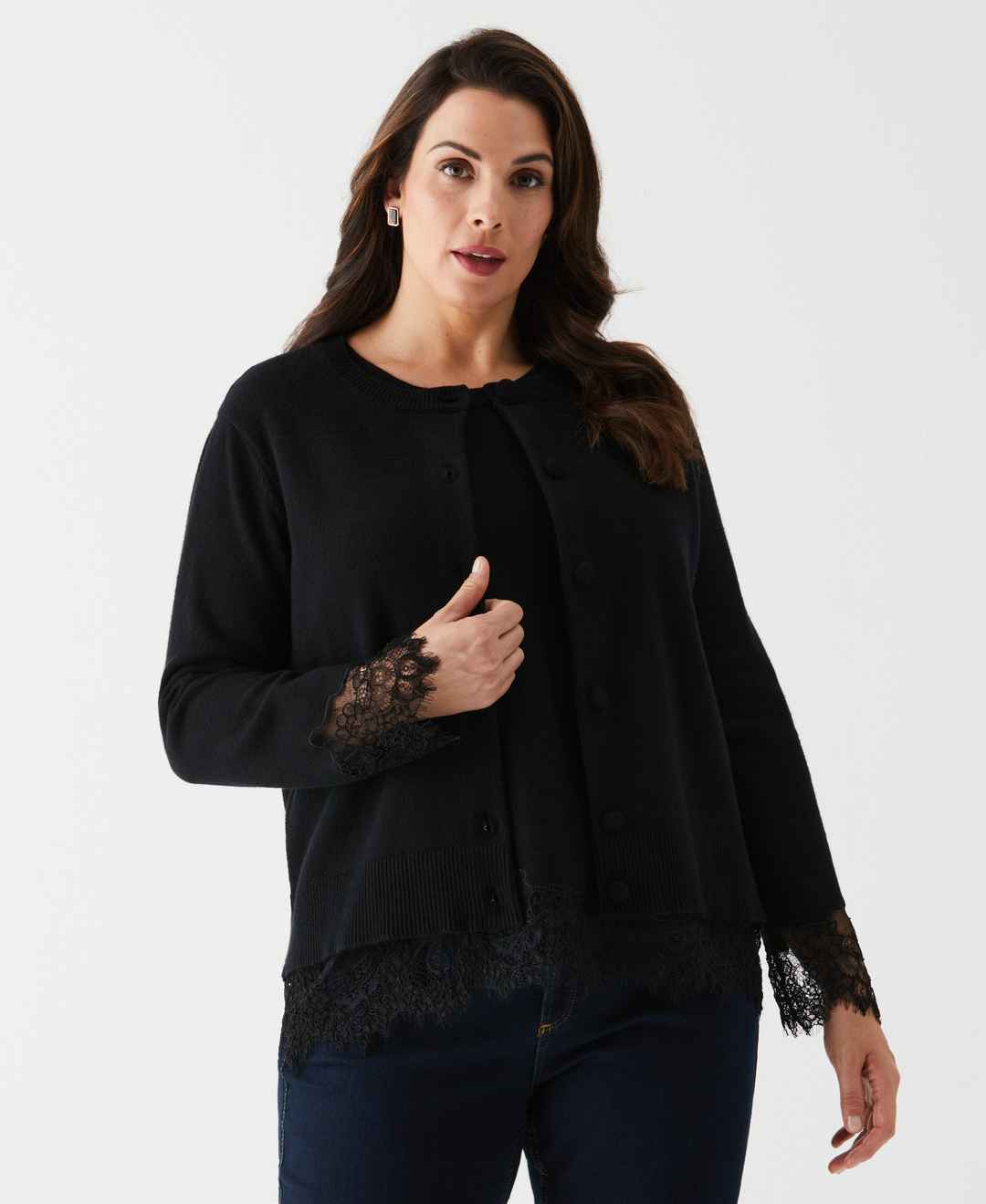 Home Rafaella Ella by Rafaella Women's Plus Size Lace Trim Button Cardigan Top in Black, Size 1X, Solid, Viscose/Polyester/Nylon
