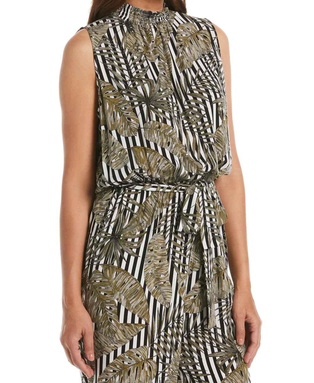 Made from a soft and cool challis fabric, this printed jumpsuit from Rafaella will help you move through spring and summer days in comfort and style. The womens jumpsuit has an elastic waistband and a matching fabric tie to help ensure a flattering, customized fit. The mock neck is smocked for eye -...more