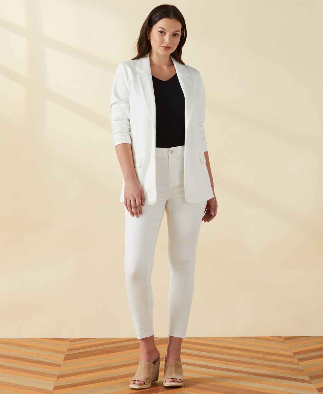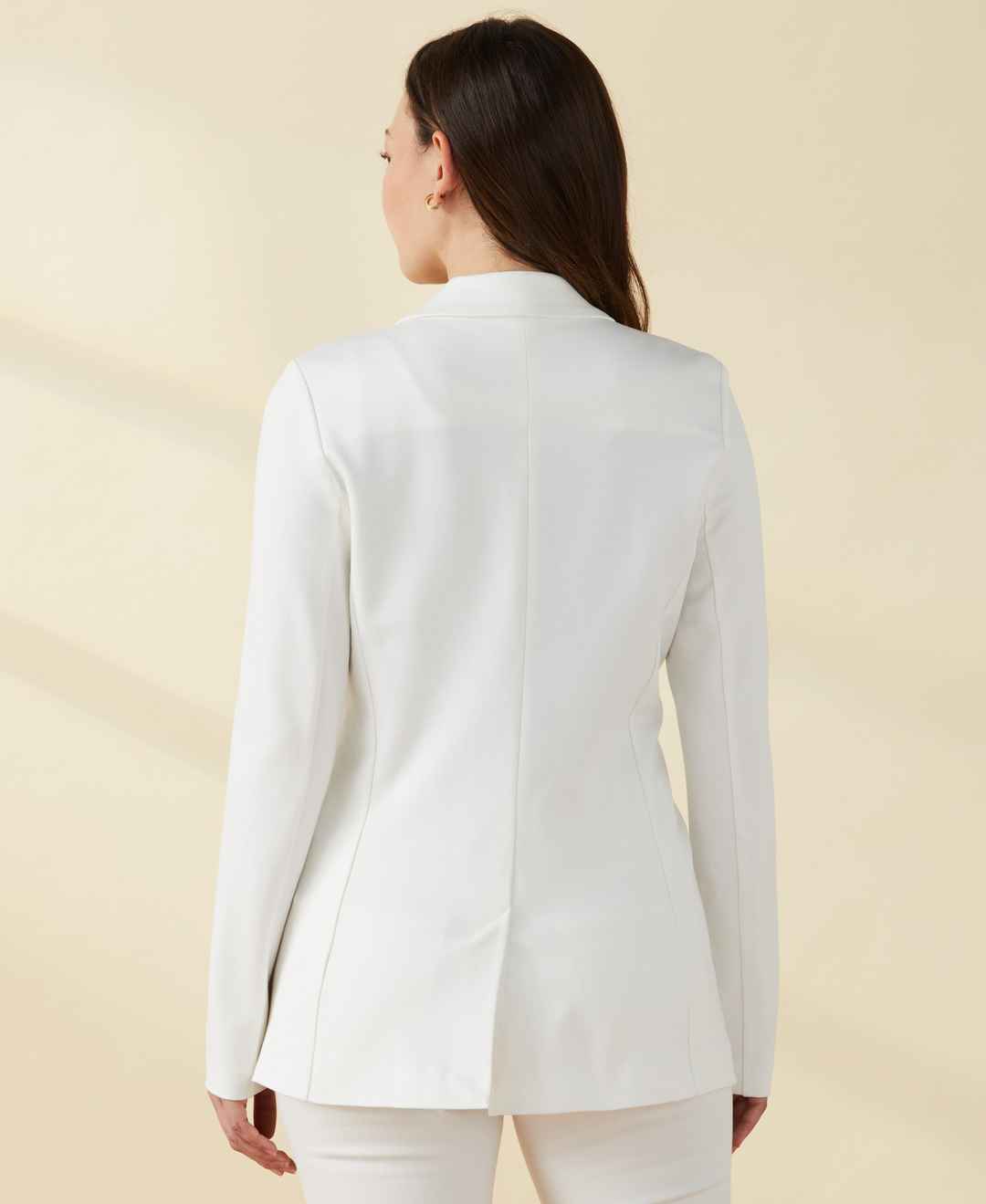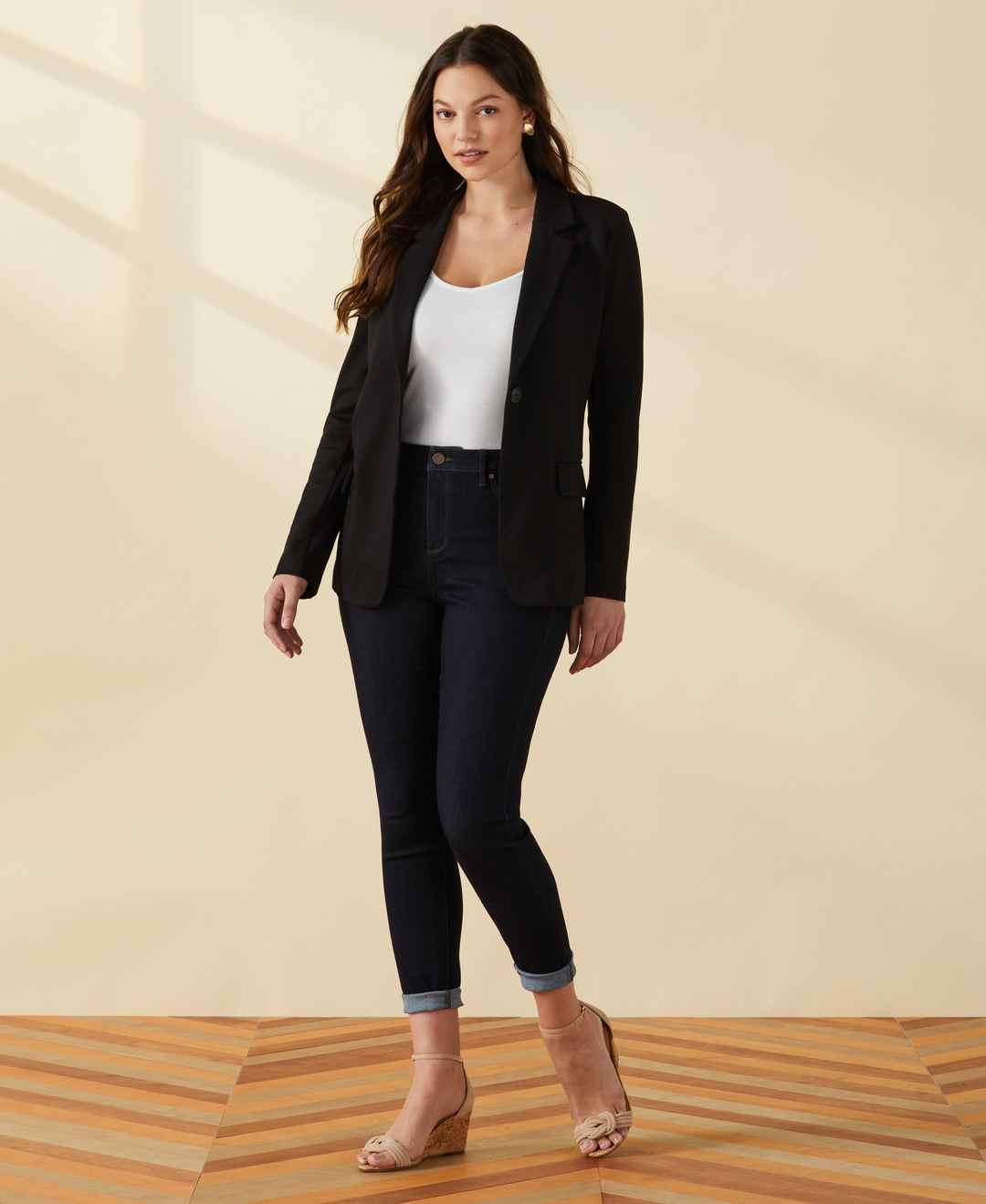 Complete your office outfits with this sharp blazer from Rafaella. The womens blazer has a sleek modern fit, and its made with Ponte knit fabric that offers both a smooth, structured look and a hint of comfortable stretch. The single breasted womens jacket is completed by a single button closure, tw...more