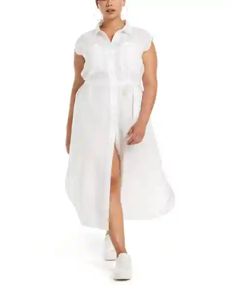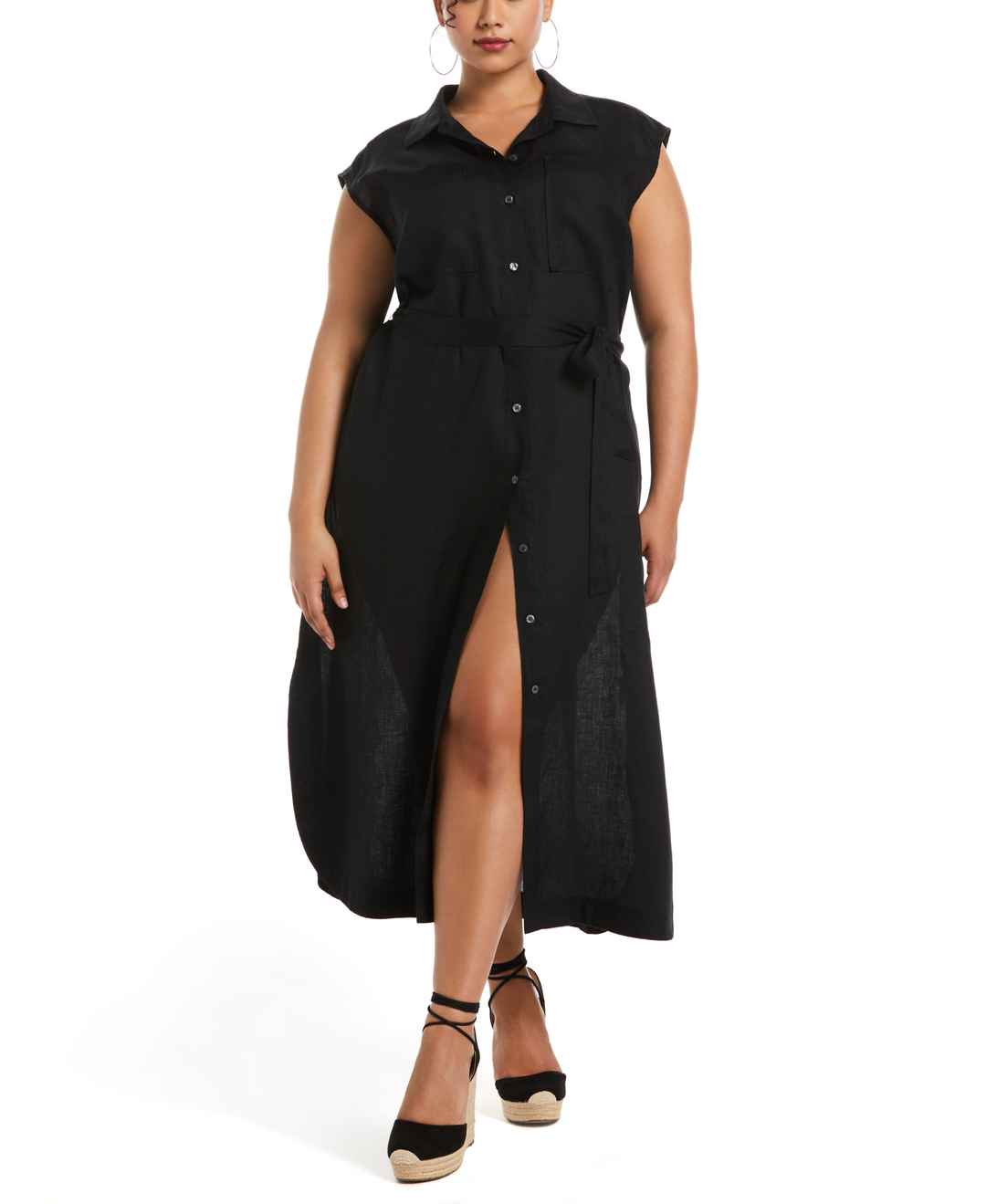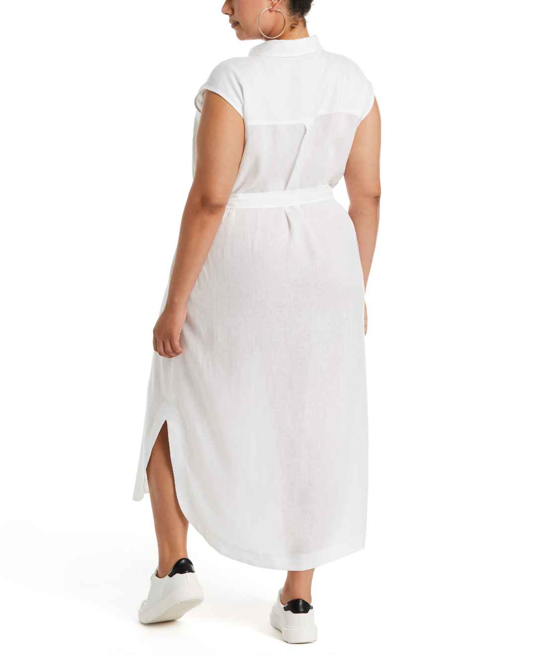 Rafaella Women's Plus Size Linen Shirtdress in White Black, Size 1X, Solid, 100% Linen