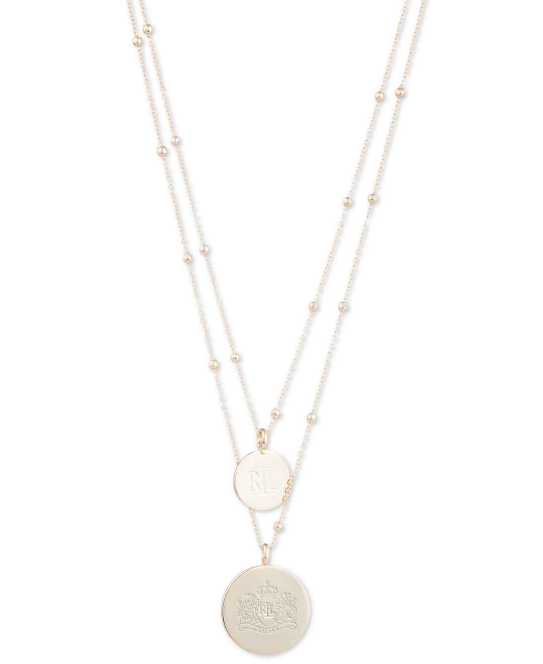 Metallic beads decorate the double-chain design of this engraved pendant necklace from Lauren Ralph Lauren.