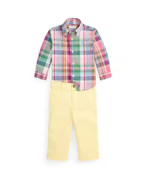 Classic tailoring shapes this Polo Ralph Lauren poplin shirt and pants set with timeless plaid detailing. Buttoned cuffs, a structured placket, and an adjustable waist support easy movement and wearability.