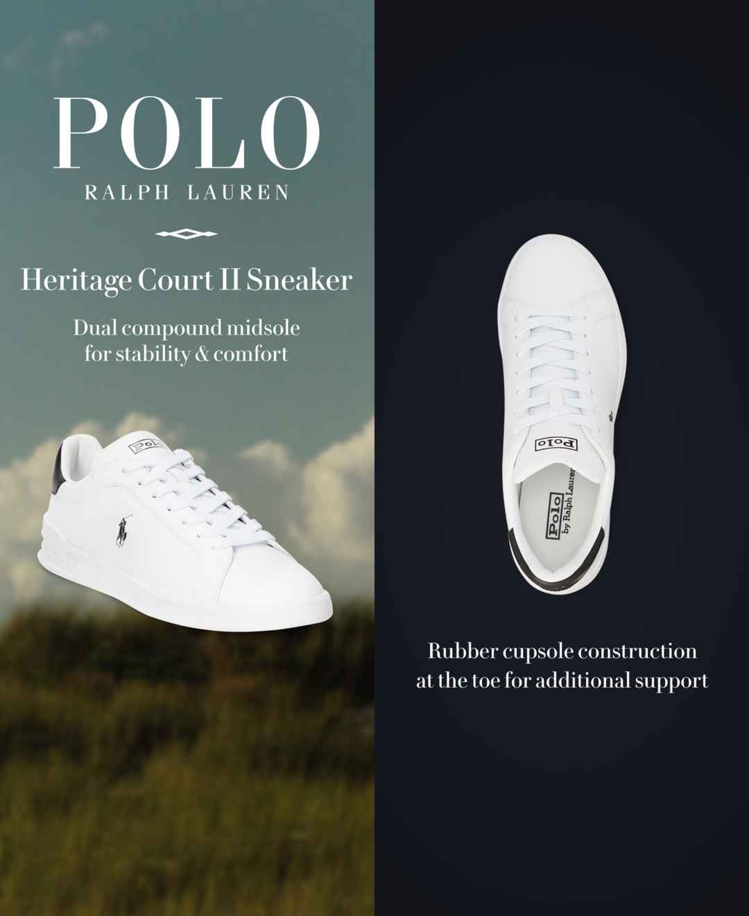 The classic silhouette of Polo Ralph Lauren's Heritage Court Ii is inspired by shoes worn by early tennis professionals. Featuring a leather upper and a rubber cupsole construction with integrated heel support, it's finished with a dual-compound Eva midsole for premium comfort.