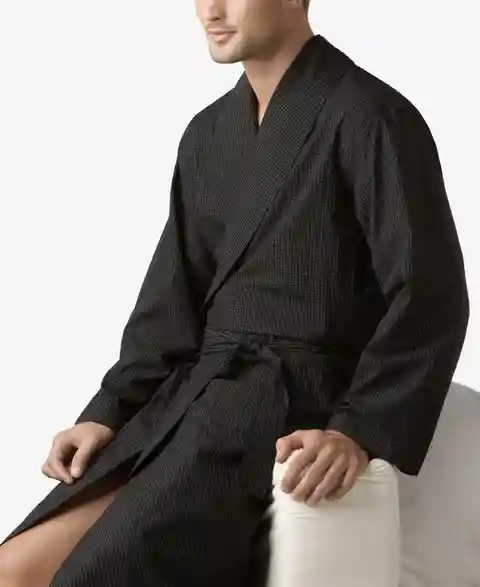 Warm up to the day in this handsome cotton robe. Windowpane pattern all over with shawl collar and belt closure. Contrasting embroidered logo at left chest.