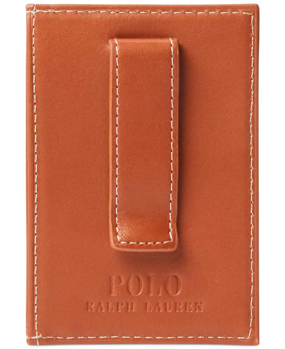 Polo Ralph Lauren's burnished leather card case includes a money clip at the back, offering a streamlined solution for carrying essential cards and cash.