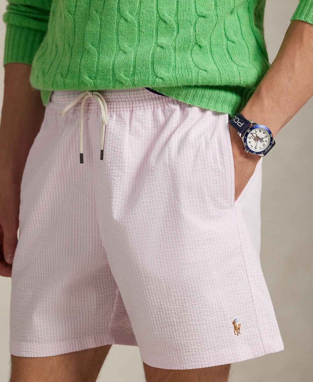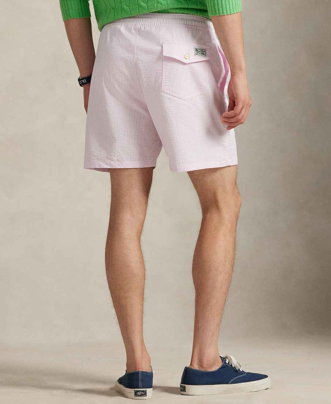 Polo Ralph Lauren Men's 5-3/4" Traveler Classic Striped Swim Trunk - Carmel Pink Seersucker