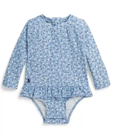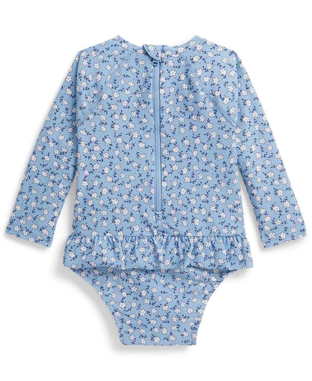 Ruffle trim and a floral pattern offer cute style to this Polo Ralph Lauren one-piece rash guard for baby girls. It provides reliable protection for enjoyable beach trips and fun-filled pool days.