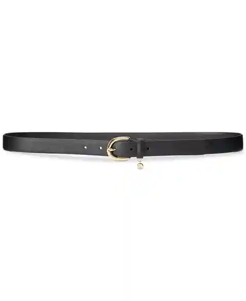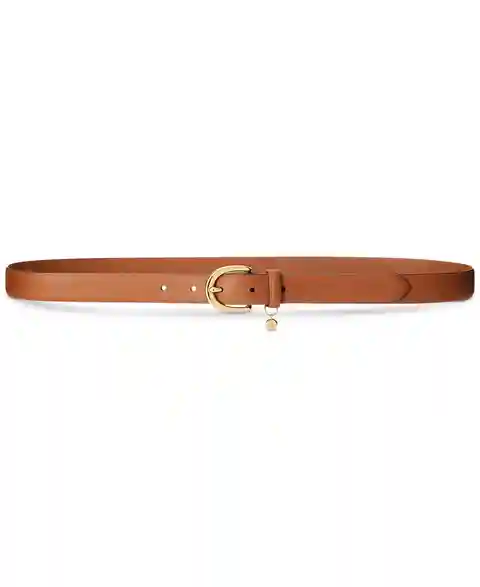 A logo-engraved charm and shiny buckle finish this luxurious crosshatch leather belt by Lauren Ralph Lauren.