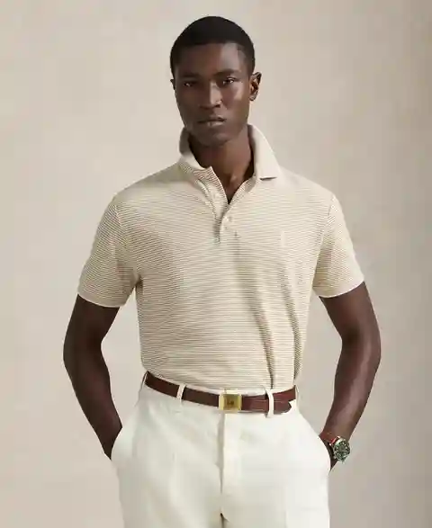 Classic style gets a modern refresh in this Polo Ralph Lauren polo shirt, crafted from stretch mesh fabric inspired by Oxford cloth and tailored in a classic fit. Striped detailing and button accents highlight the brand's iconic quality and attention to detail.