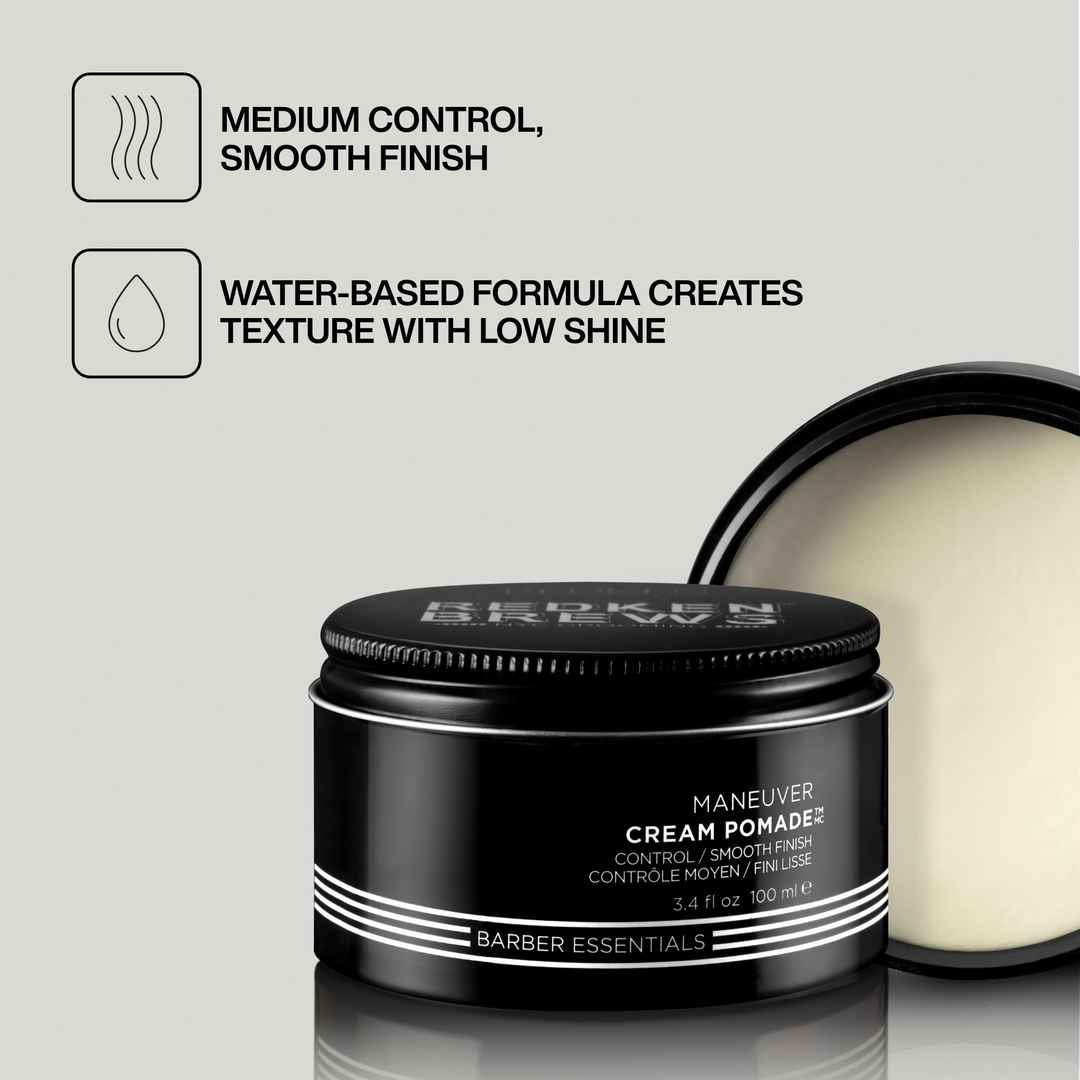 The Cream Pomade adds a smooth, natural finish that creates a low shine, textured men's hairstyle with maximum hold. BENEFITS Water-based formula Natural finish Creates texture with low shine Great for pompadours and smooth, flexible styles | Redken - Brews Cream Pomade: Medium Hold & Natural Fi...more
