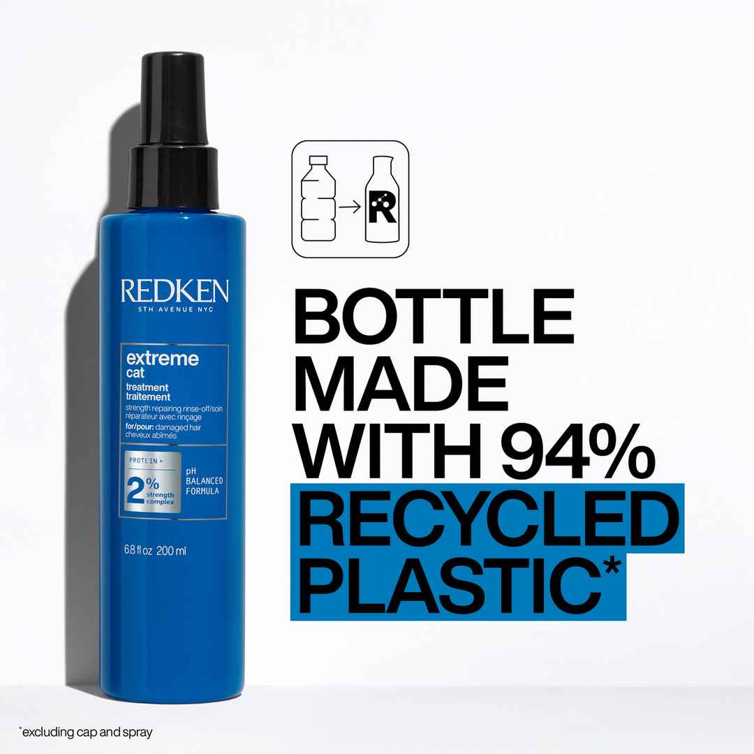 Redken's powerful prescription to reconstruct damaged proteins to reinforce distressed hair, Redken Extreme CAT treatment is a rinse-out to strengthen strands against hair breakage. Extreme CAT treatment is also used by Pros to prep and strengthen hair prior to chemical services that can disrupt the...more