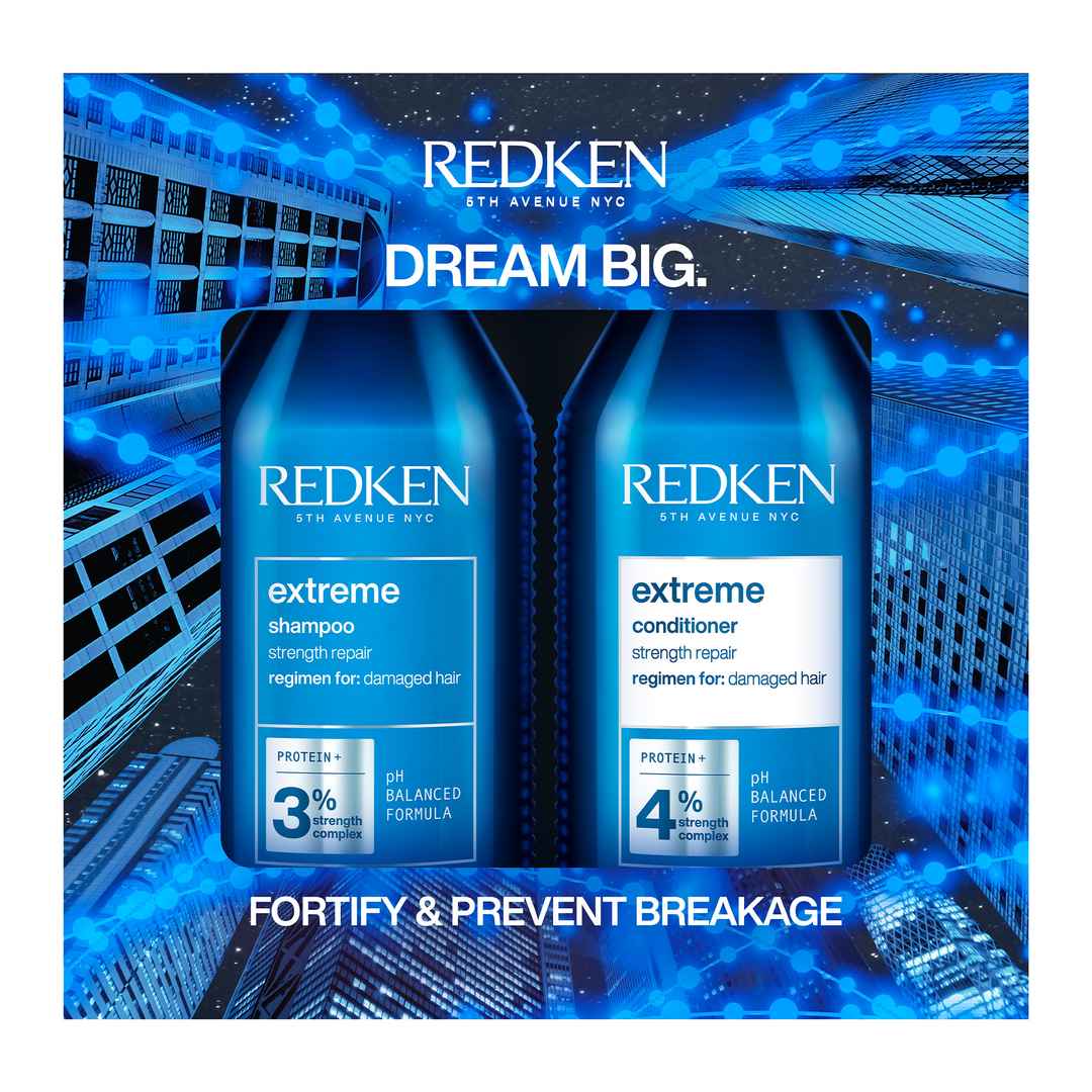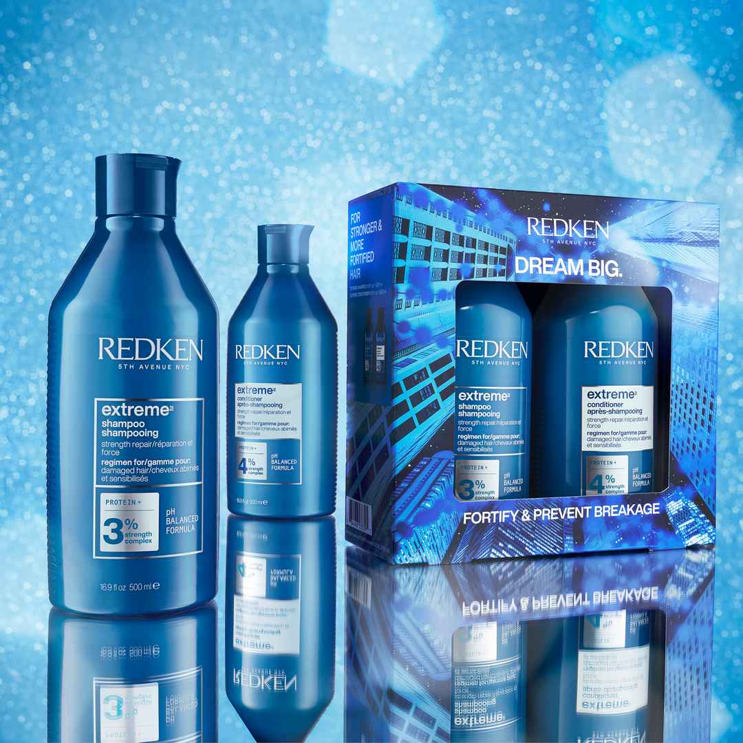 Dream Big, Dream Redken with a giftable, limited edition holiday set that includes Extreme Shampoo and Conditioner ($70 VALUE) to restore damage, prevent future breakage, strengthen and fortify hair. EXTREME SHAMPOO (500mL) Prescribed for damaged hair, Redken Extreme Shampoo cleanses, strengthens, a...more