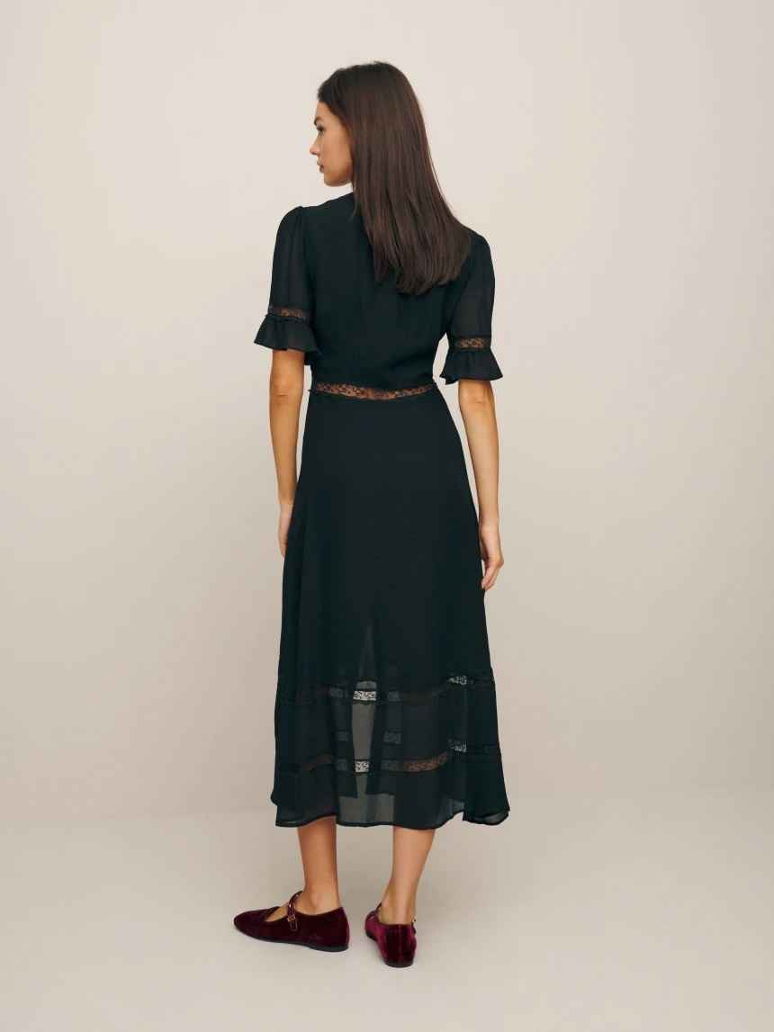 The Woodson is a dreamy short-sleeve, midi length, slim-fitting dress. It features a button front and lace detailing throughout.