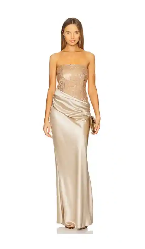 retrofete Alexandra Dress in Metallic Gold. - size M (also in S) retrofete Alexandra Dress in Metallic Gold. - size M (also in S) 76% acetate 24% polyester. Made in China. Hand wash cold. Partially lined at bodice. Hidden side seam zipper closure. Non-slip silicone neckline. Midweight draped satin f...more