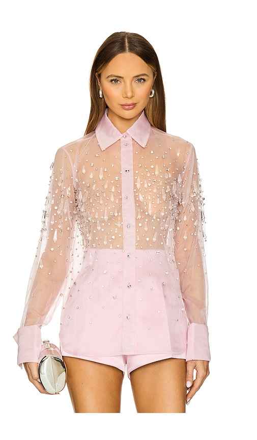 retrofete Aubriella Embellished Shirt in Rose. - size S (also in M) retrofete Aubriella Embellished Shirt in Rose. - size S (also in M) 100% nylon. Made in India. Dry clean only. Front button closure. Crystal embellishing throughout sleeves and front of top. Crystal-embellished cuff links. Garment i...more