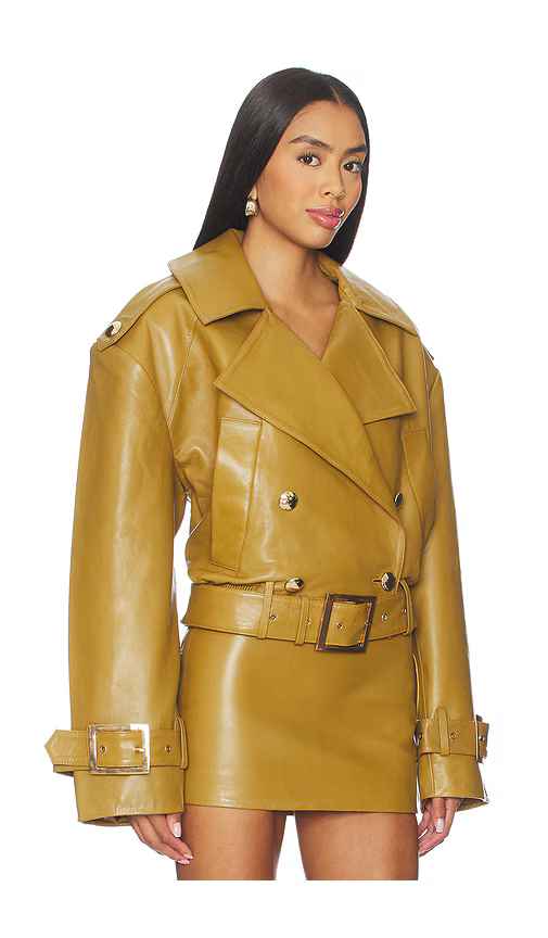retrofete Malene Leather Jacket in Olive. - size M (also in XS) retrofete Malene Leather Jacket in Olive. - size M (also in XS) Self: 100% real lamb leather Lining: 100% polyester. Professional leather clean only. Double breasted closure with optional belt. Side pockets. Midweight leather with padde...more