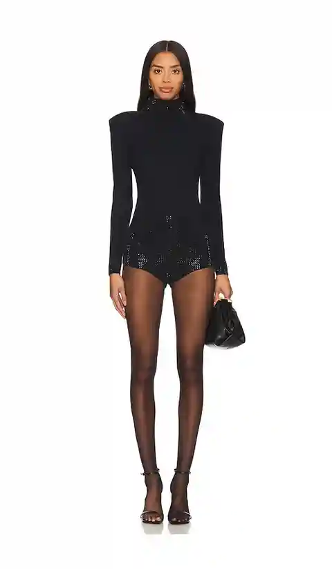 retrofete Bethanie Romper in Black. - size XXL (also in L, M, S, XL, XS) retrofete Bethanie Romper in Black. - size XXL (also in L, M, S, XL, XS) 95% cotton 5% metallic. Dry clean or hand wash. Hidden back zipper closure. Stone embellished cuffs, waist and neckline. Midweight knit fabric with padded...more