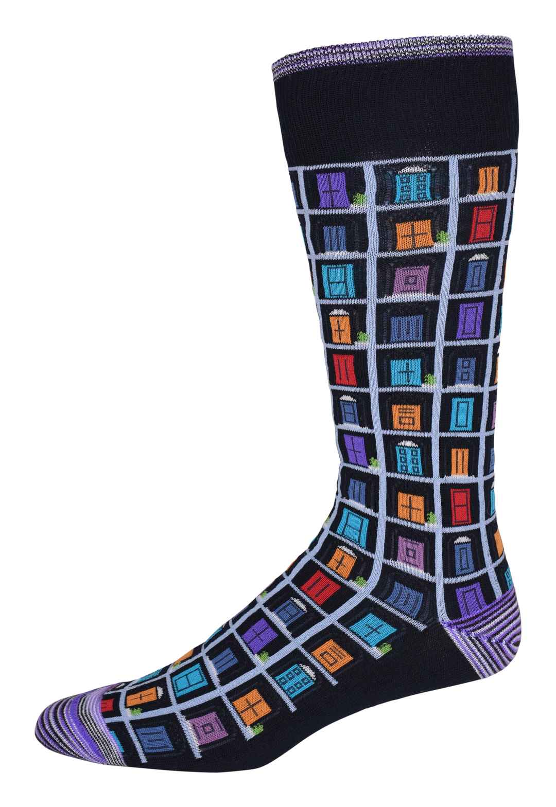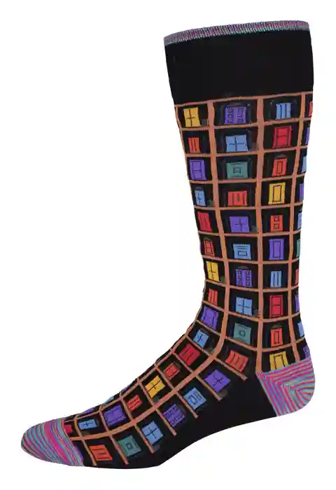 Open the door to standout style with this playful architectural pattern. A vibrant grid of windowpane motifs and colorful doors turns your basic sock into a conversation starter,. Reinforced striped panels at the heel and toe deliver the ultimate in comfort and style. Reinforced striped panels at he...more