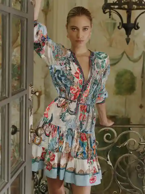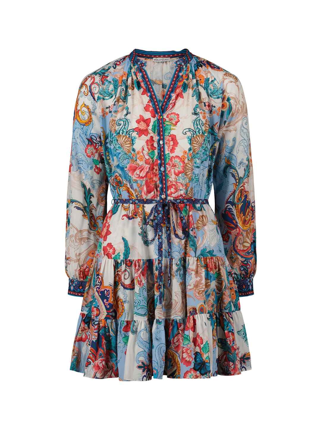 Throw on this flirty dress and get ready to turn heads all night. Beautiful florals bring life to this style, with geometric prints at the collar, placket, and cuffs adding a bit of interest. Gathered skirt tiers and blouson sleeves give you beautiful movement, while the self-tie belt keeps definiti...more