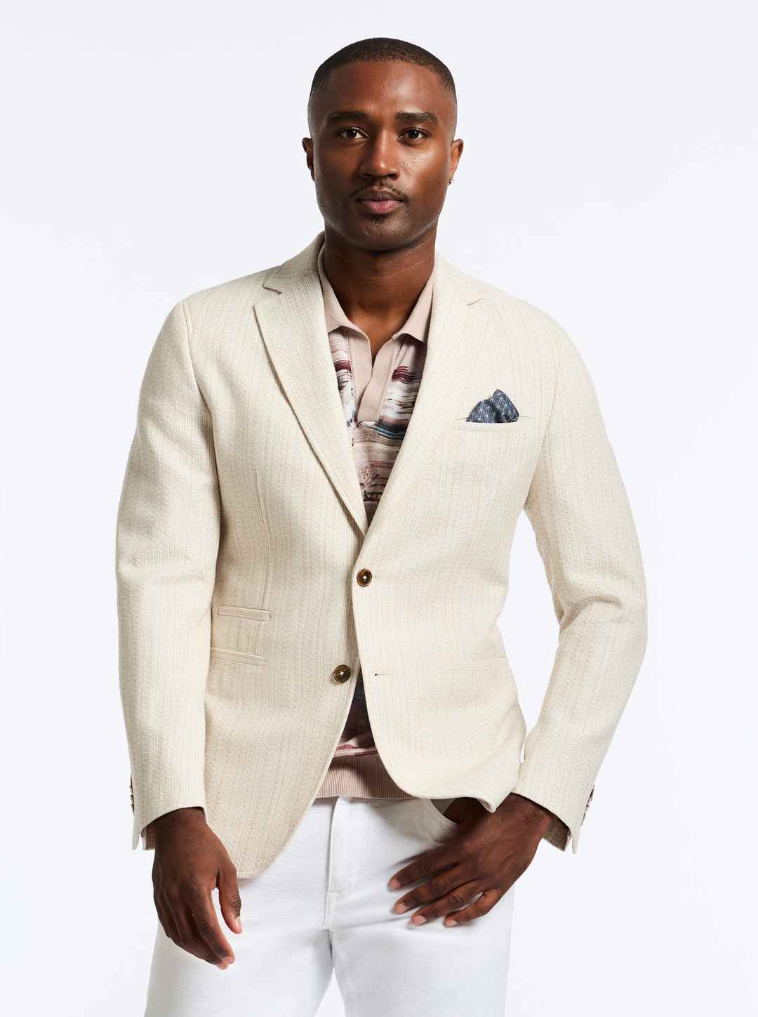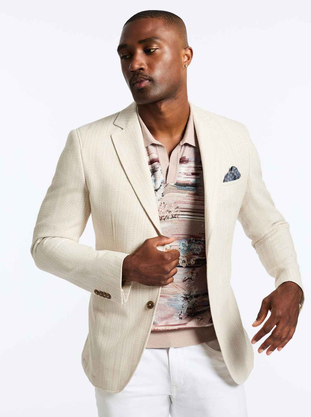 Exude quiet confidence in this season's must-have wardrobe staple. You'll love the ease of layering this unlined style over your favorite button down. An elegant pullout pocket square adds a dapper finishing touch to this neutral piece. Notched lapel with two button closure Long sleeve with lightly ...more