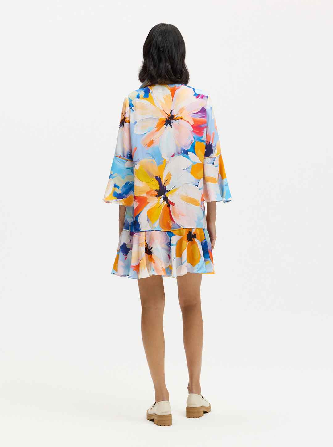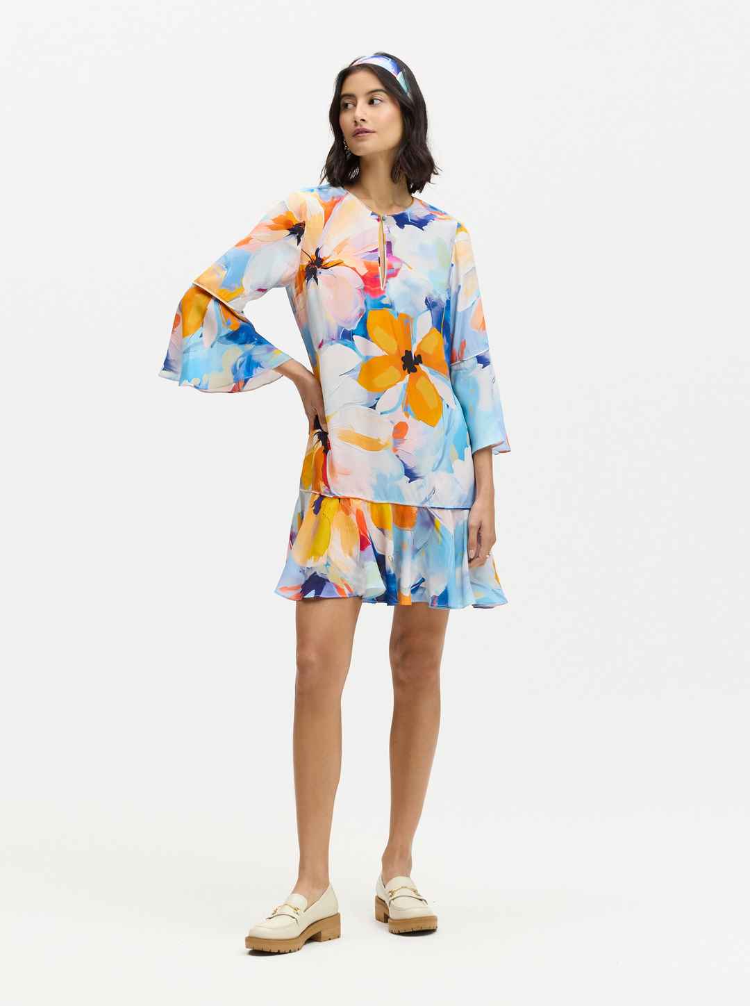 Slip on this relaxed fit dress and feel the cheerful vibes emanating from the vivid florals. 3/4 sleeves and an A-line silhouette are accentuated with the ruffle hemline. Notice the flirty keyhole opening with novelty button. Keyhole neckline Novelty button at neck Floral print 3/4 sleeves with ruff...more