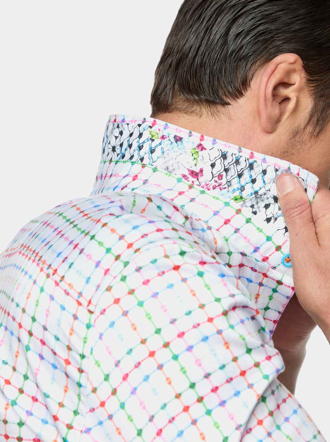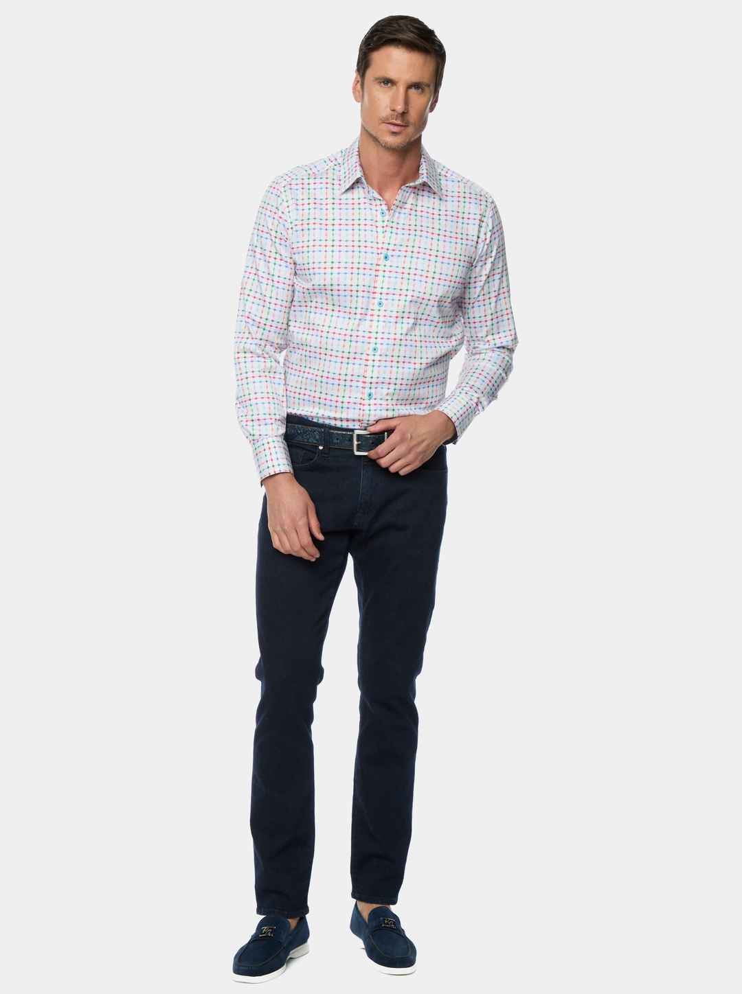 A textured print from afar looks like a picture-perfect print up close. This artistic twist on a check pattern is sure to turn heads at your next event. Pair with your favorite denim to complete the look. Point collar Full button front placket Check print Contrast jacquard with piping at inside yoke...more
