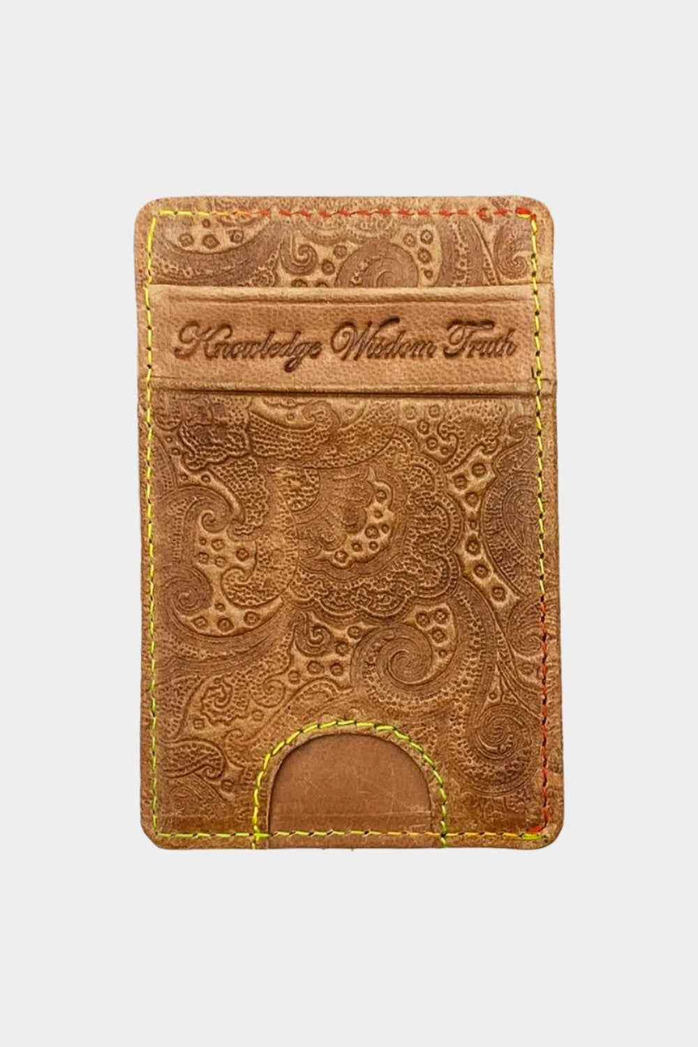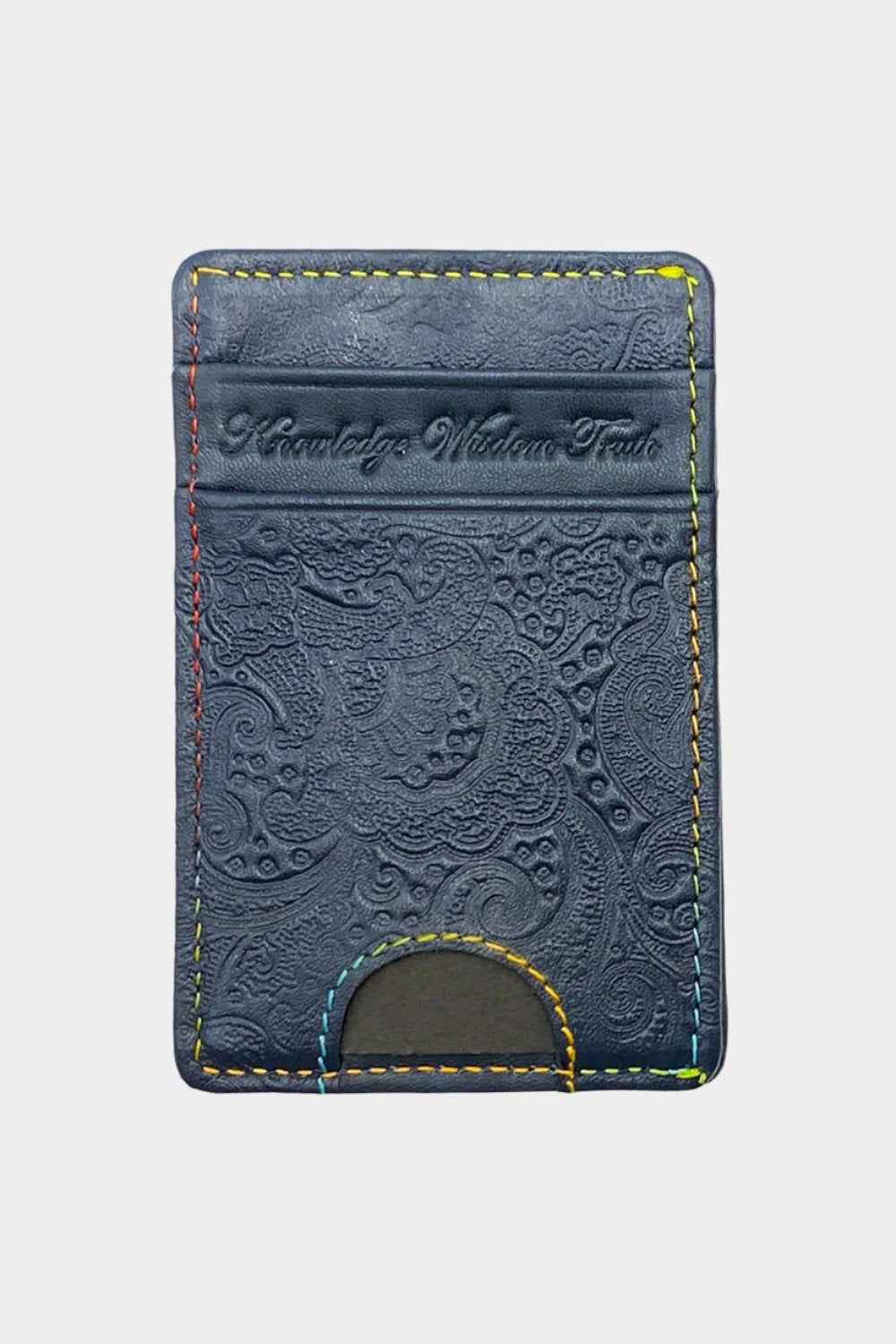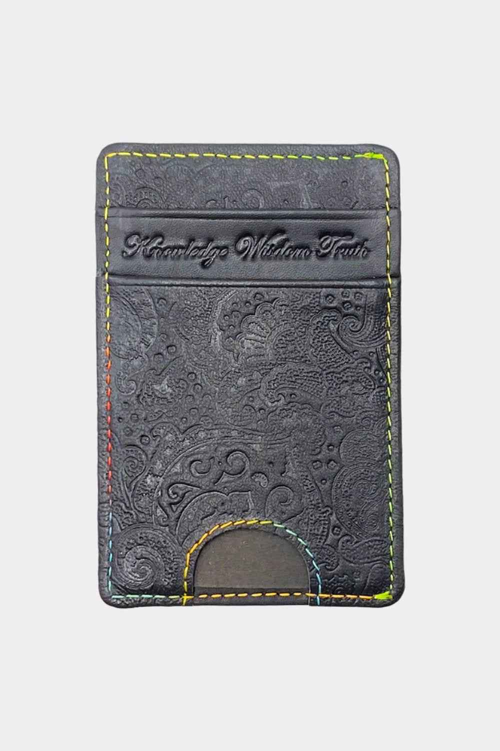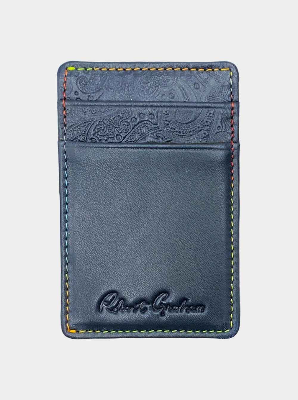 Top quality leather card case embossed with the Robert Graham signature paisley motif. Contrast multicolor stitching at the edges and embossed Robert Graham signature at the bottom. 100% genuine leather Spot clean Imported
